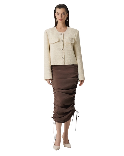 Торговая марка использует высококачественные материалы и фурнитуру. Все вещи отшиваются на собственном производстве в России, что позволяет гарантировать идеальную посадку и безупречный крой.