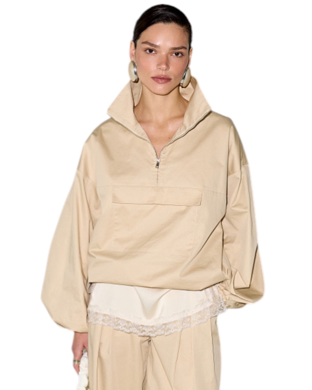 Свободный крой подходит для создания многослойных повседневных образов, добавляя ощущение удобства и свободы движения. Воротник-стойка усиливает графичность, а молния в зоне стойки позволяет регулировать глубину выреза. Ключевой деталью является накладной карман на передней части изделия.