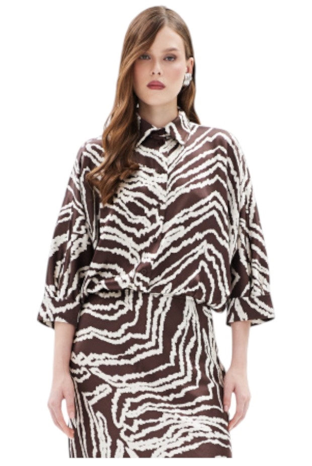 Блуза с цельнокроеным рукавом и центральной застёжкой на пуговицы. Резинка по низу изделия позволяет варьировать длину по фигуре.