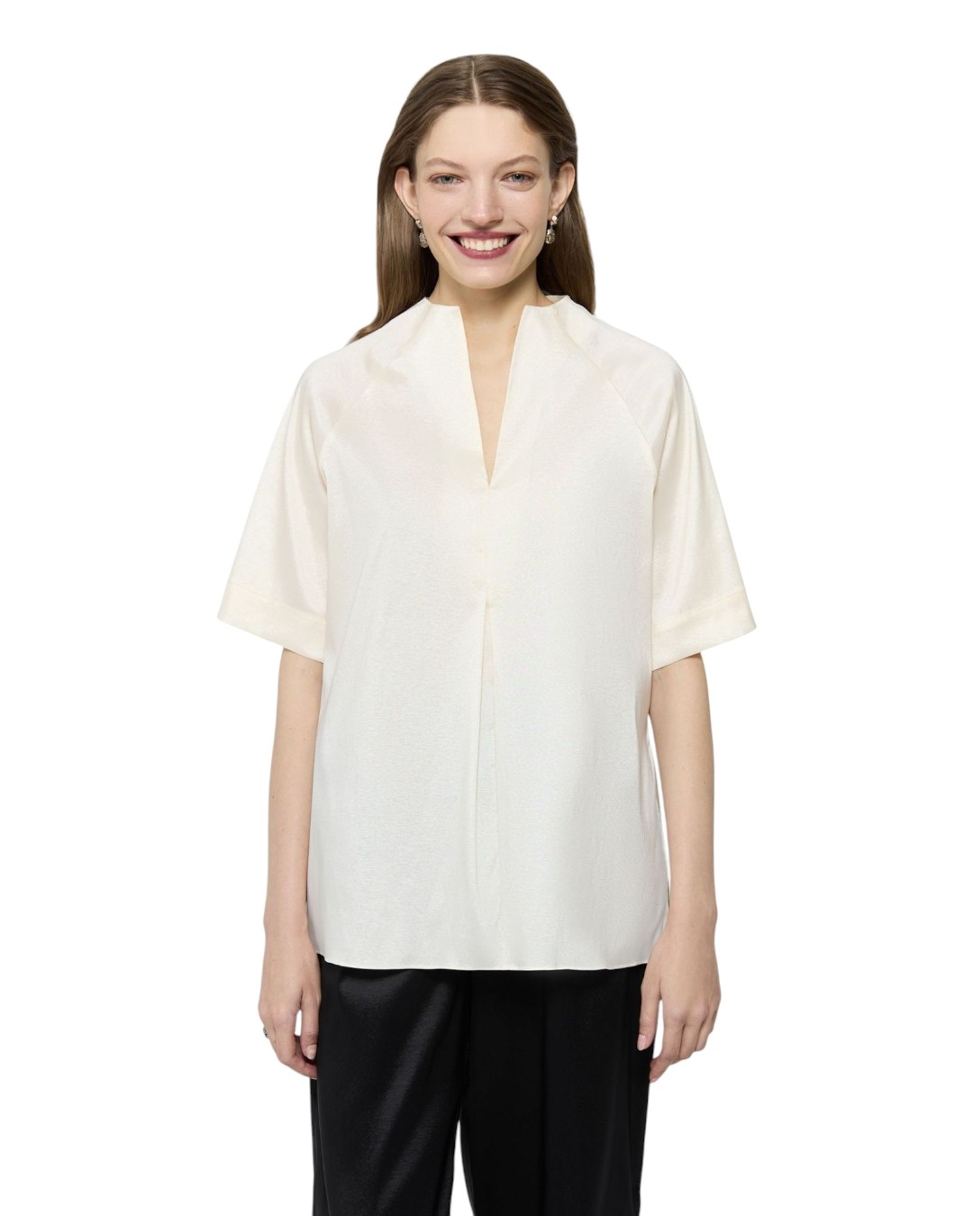 Блуза свободного кроя сшита из тафты с матовым деликатным блеском.