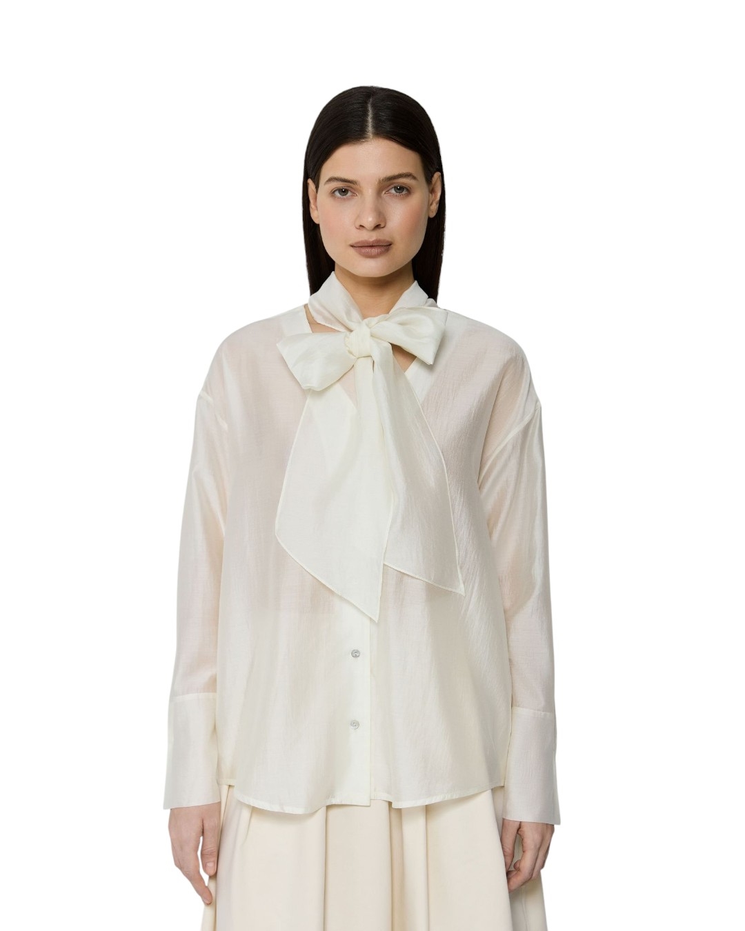 Блуза свободного покроя, чуть удлинённая, выполнена из вуали (плотного шифона, в составе натуральный тенсел - аналог вискозы), полупрозрачная, очень нежная и приятная. V-образный вырез горловины, застёжка на натуральные ракушечные пуговицы по центру по планке спереди. Спущенная линия плеча, длинный рукав с необычной манжетой по низу, можно застегнуть как обычно на пуговицу, а можно на манер запонок (пуговица пришита на одном месте и с изнанки и с лица, с помощью этого приема получается застегнуть разным образом), снизу по рукаву получается небольшой разрез. Спинка с отрезной кокеткой и заложенной складкой. Фигурный низ изделия, спинка длиннее переда. Блуза дополнена объемным длинным шарфом из аналогичной ткани, можно носить в комплекте с блузой или без, завязать можно различными способами (также для шарфа предусмотрена внутренняя скрытая шлевка для продевания сзади сверху по спинке с изнанки, чтобы он не съезжал)