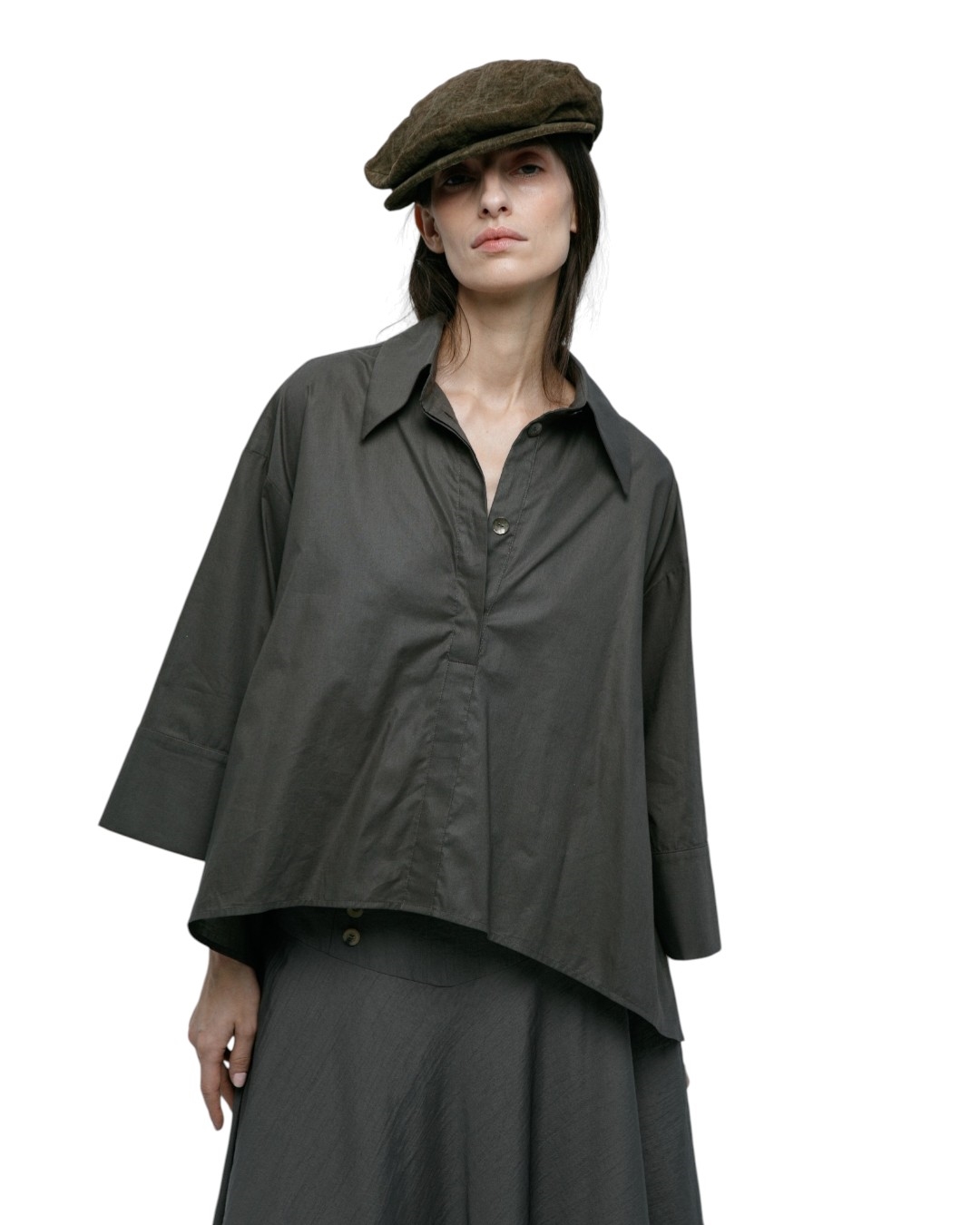 Блуза свободного кроя с объемными рукавами. Фиксируется на пуговицы и втачной пояс пристегнутый на пуговицы.