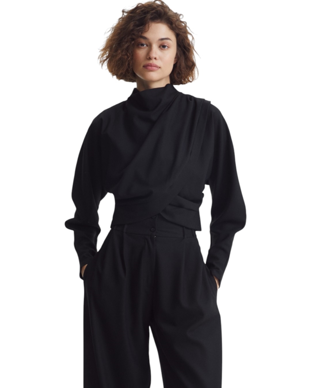 Блуза украшена сложной драпировкой спереди, которая создает женственный и элегантный образ. Для пошива модели с зауженными рукавами использовали приятный материал костюмной смесовой вискозы. Спинка блузы застегивается на молнию.