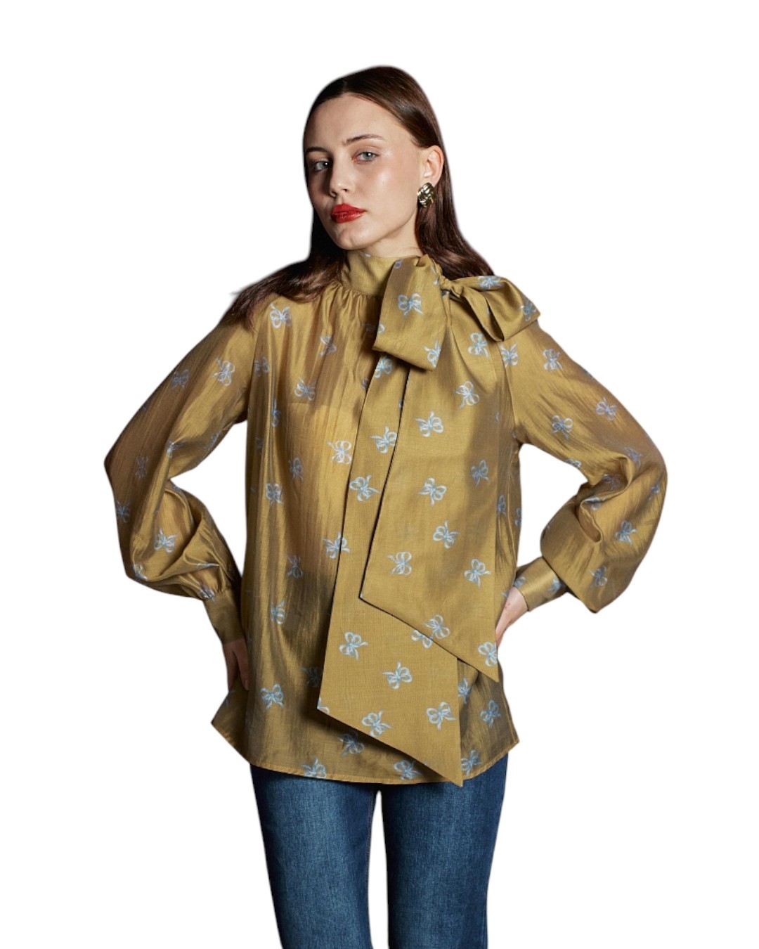 ворот-стойка на пуговицах сзади, украшен длинными деталями, которые можно завязать бантом или как шарф нежный;