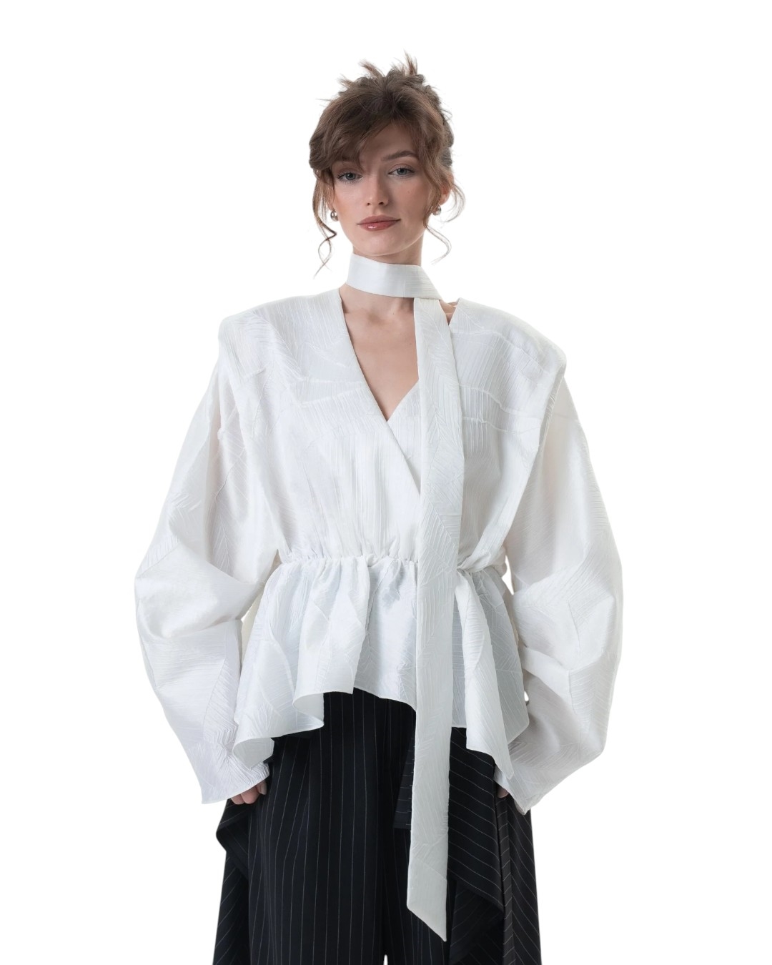 Блуза с акцентными плечами из жатой ткани, создающей невероятно красивую фактуру. Мы подчеркнули силуэт сборками на талии, сделали необычный рукав О-образной формы с защипами. В комплекте с блузой идет шарфик, который вы можете стилизовать совершенно по-разному!