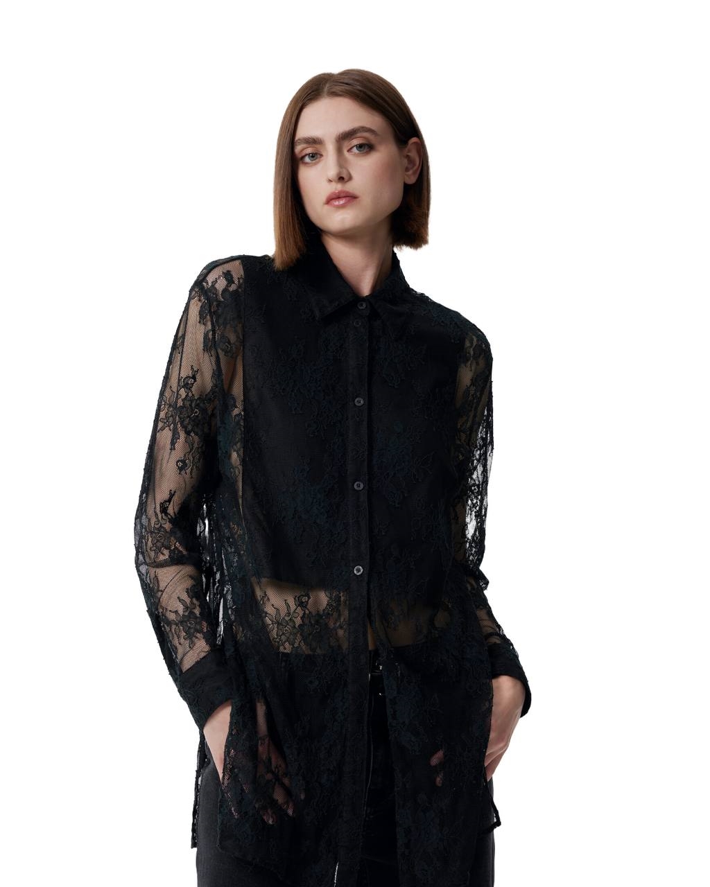 Удлиненная кружевная блузка - олицетворение женственности, утонченности, притягательности. Выполненная из ажурного трикотажного полотна с флористическими мотивами, блузка прямой свободной формы прекрасно впишется и в нарядные, и в деловые, и в повседневные образы тех, кто готов примерить на себя что-то новое. Кружевную блузку можно дополнить топом или майкой, а также сознательно отказаться от них, создав смелый и провокационный образ. На внутренней части блузки расположена тонкая манишка геометрической формы, исключающая просвечивание в зоне лифа. Блузка имеет высокие разрезы в боковых швах, способствующие комфортной эксплуатации. Она застегивается на пуговицы.