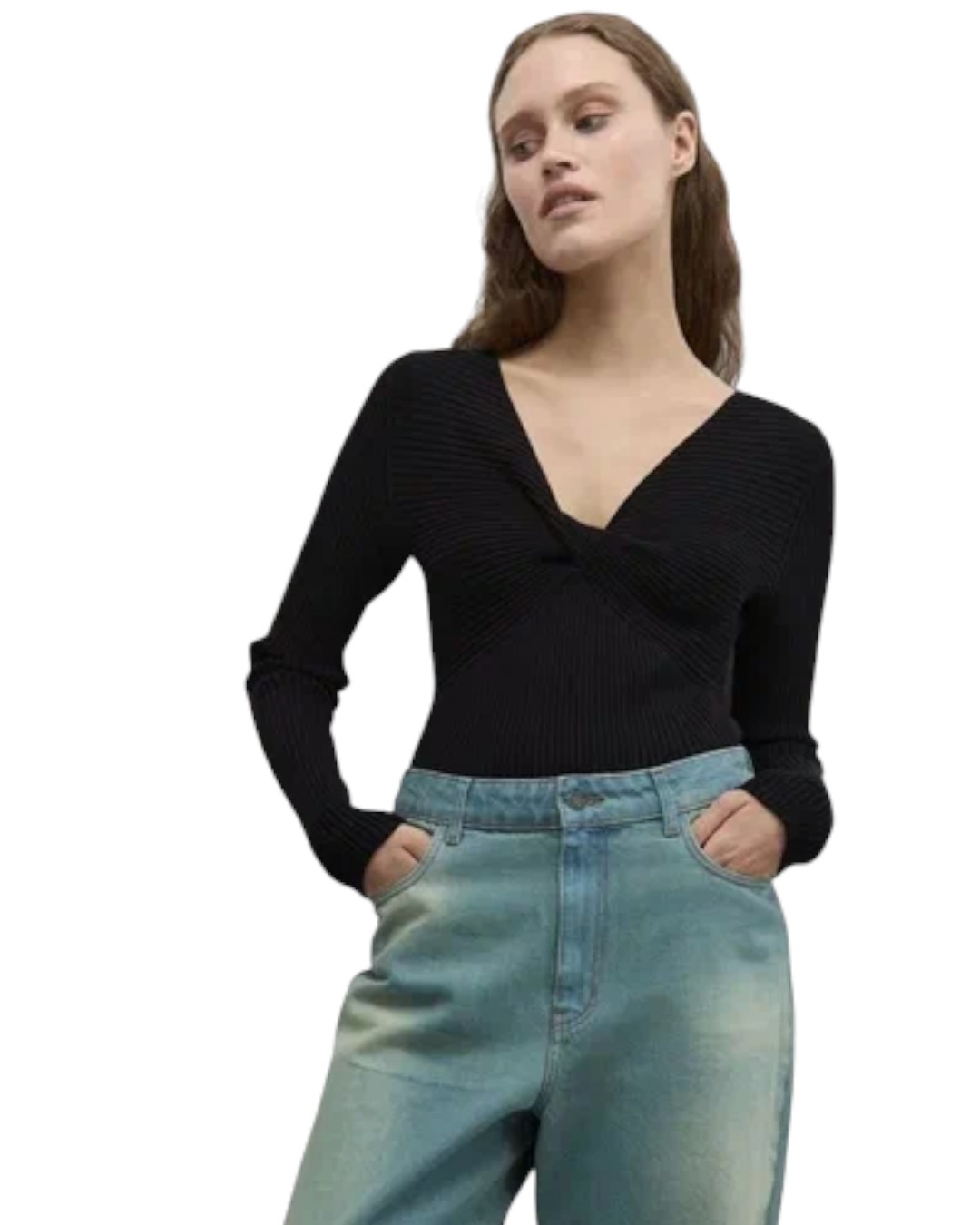 V-образный вырез с глубоким декольте и декоративным узлом. Трикотажные полотна сшиты между собой особым образом: вертикальный рубчик по талии вытягивает силуэт, а диагональный на груди подчеркивает ее форму. На ластовице застежка на кнопки в три ряда, позволяющая отрегулировать посадку по росту.