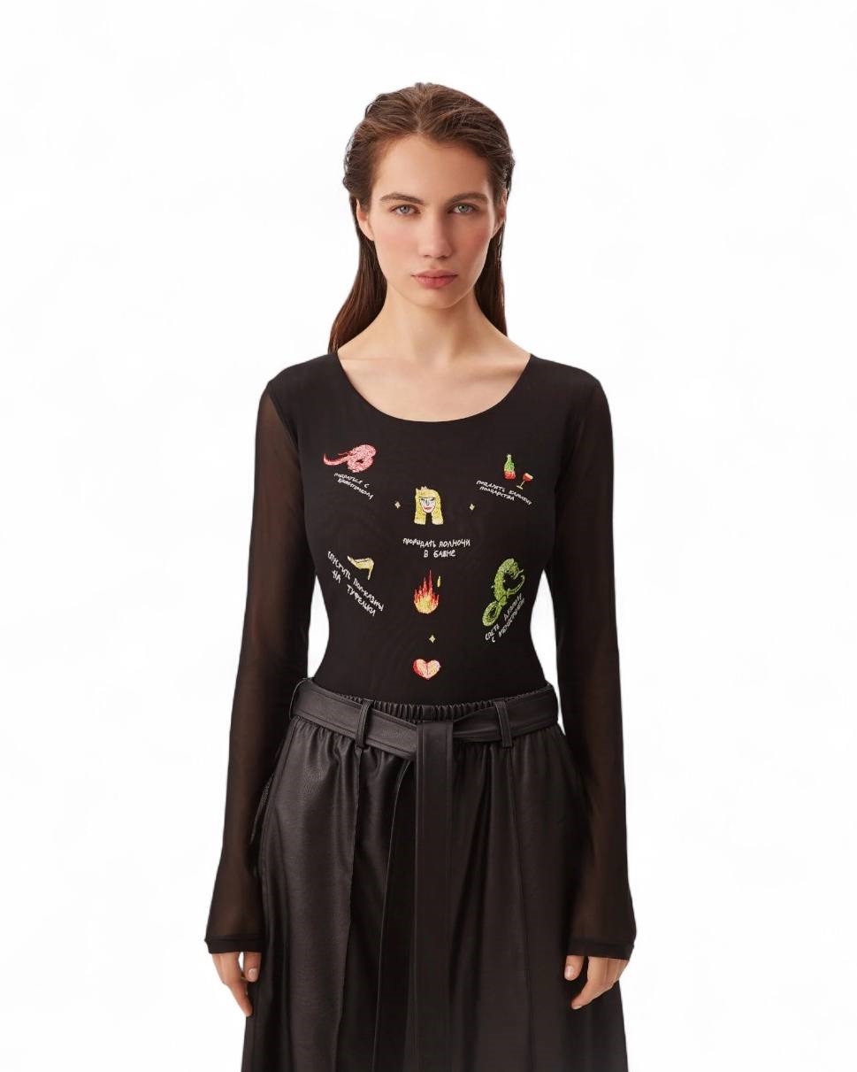 Модель с хорошим растяжением, приталенным силуэтом и авторской вышивкой "ШАЛЬНАЯ ПРИНЦЕССА" в черном цвете.