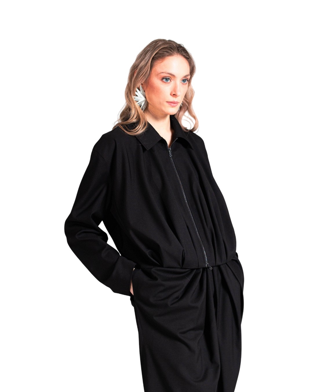 Бомбер на подкладе с застёжка молнией. Отложной воротник и сложный крой с объёмной драпировкой делает образ сложнее. Также у бомбера создано увеличенное плечо.