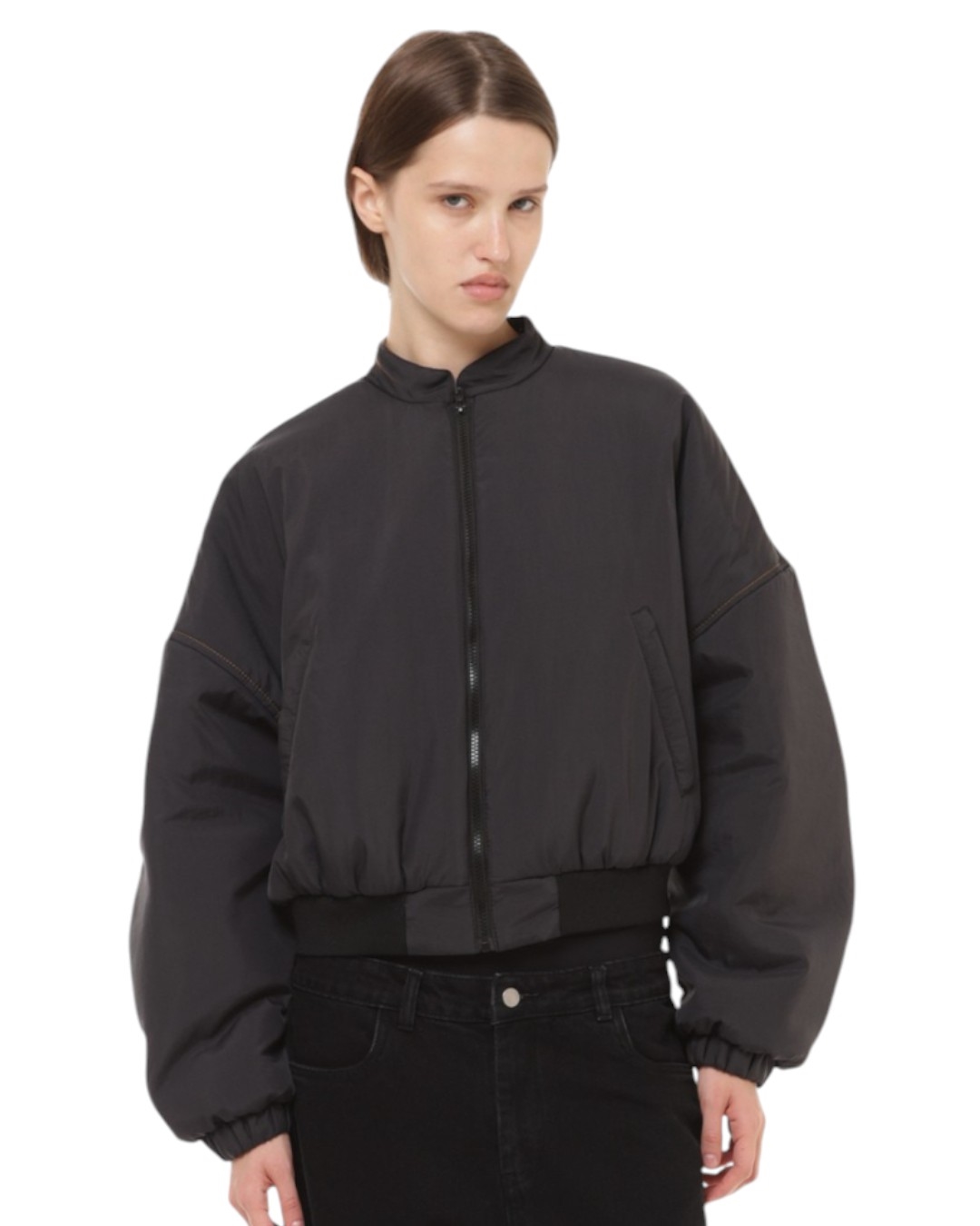 Объёмный утепленный бомбер с круглым вырезом; горловина, манжеты и нижний край отделаны эластичной резинкой. Модель дополнена накладными карманами с клапанами. Застегивается на молнию, которую закрывает ветрозащитная планка на кнопках.