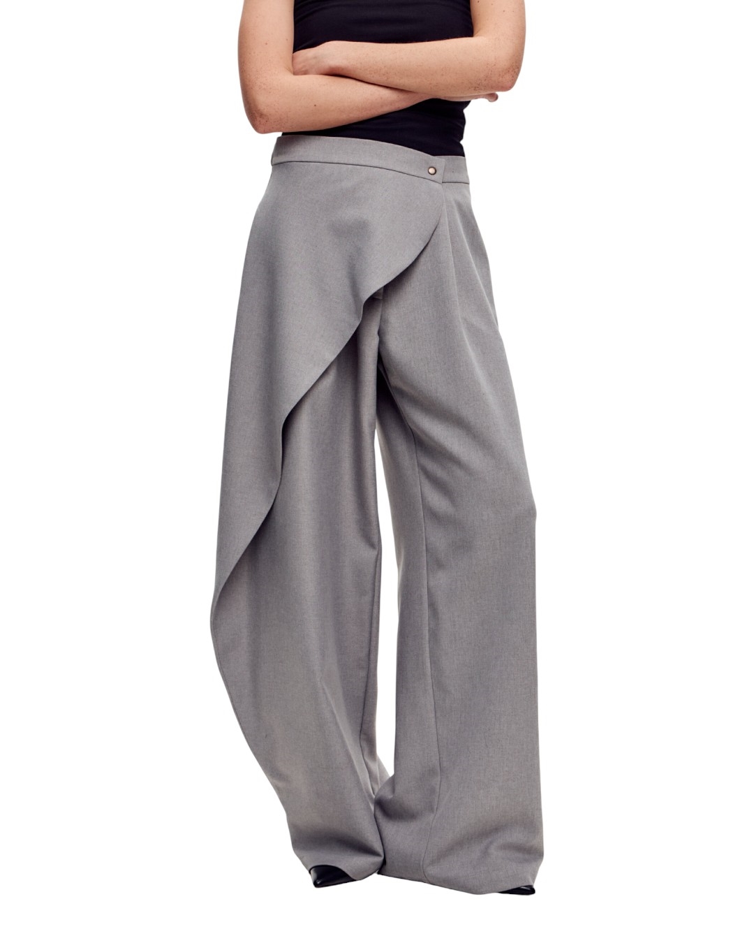 Брюки-палаццо уникального кроя, где одна из штанин двойного размера с запахом на талии. Стилизовать брюки можно с лонгсливами, бандо и сюртуками, водолазками и простыми майками.