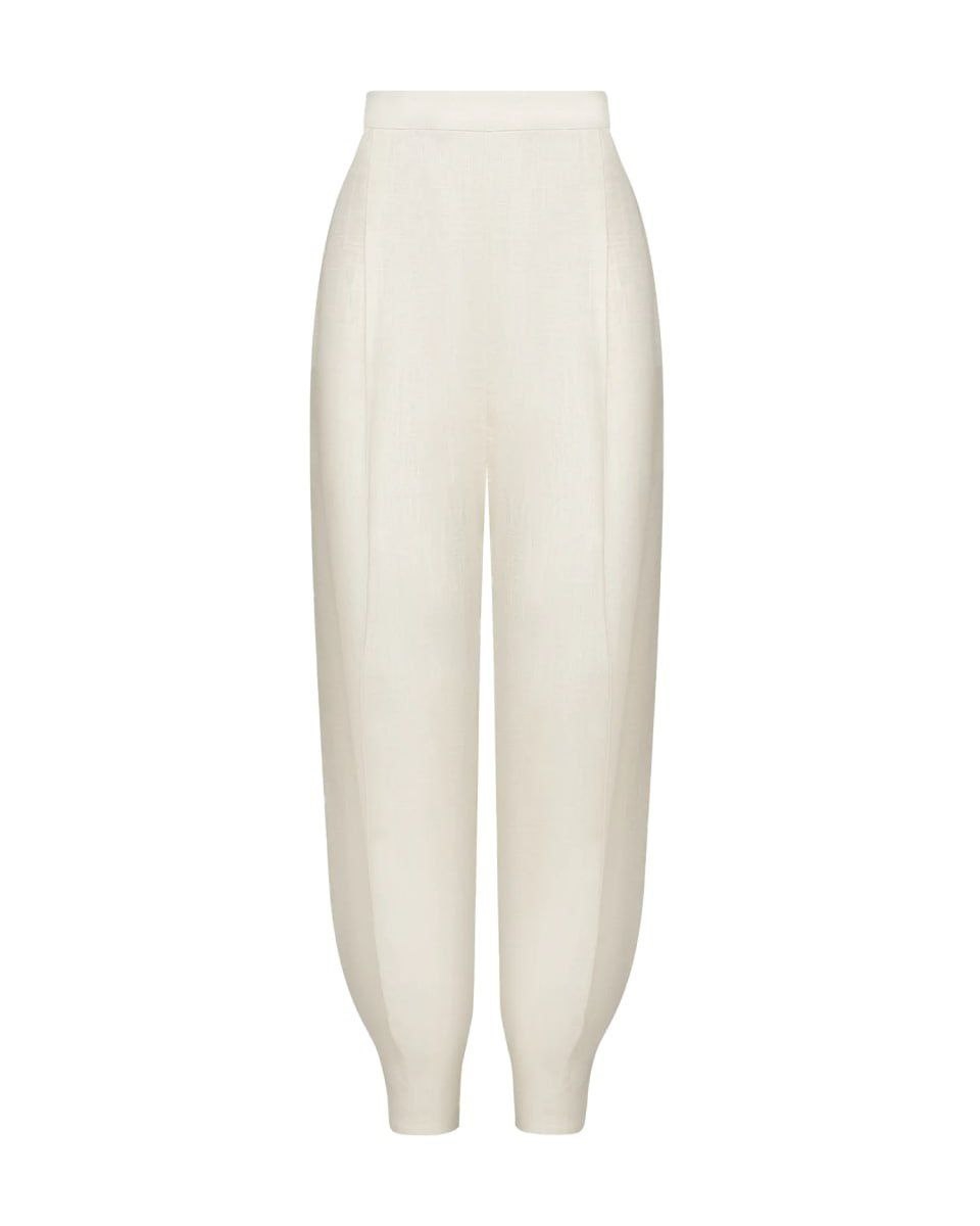Летние брюки из рами и хлопка с завышенной талией создают элегантный силуэт. Мягкие защипы на линии бедер подчеркивают фигуру, сохраняя при этом комфорт и свободу движений. Прямой крой плавно сужается к низу, где фигурная застрочка формирует изящную волну драпировки.
