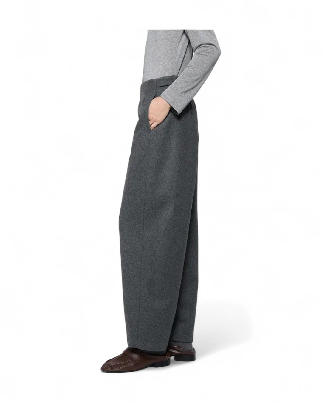 Длинные брюки «barrel pants». Их особенность в округлом силуэте: крой расширен в области колен и слегка заужен к низу. Модель без отрезного пояса. На талии есть хлястики, которые можно перестегнуть на пуговицы. От этого зависит посадка: более приталенная, средняя или слегка на бедрах. Брюки застегиваются на потайную застёжку-молнию сзади.