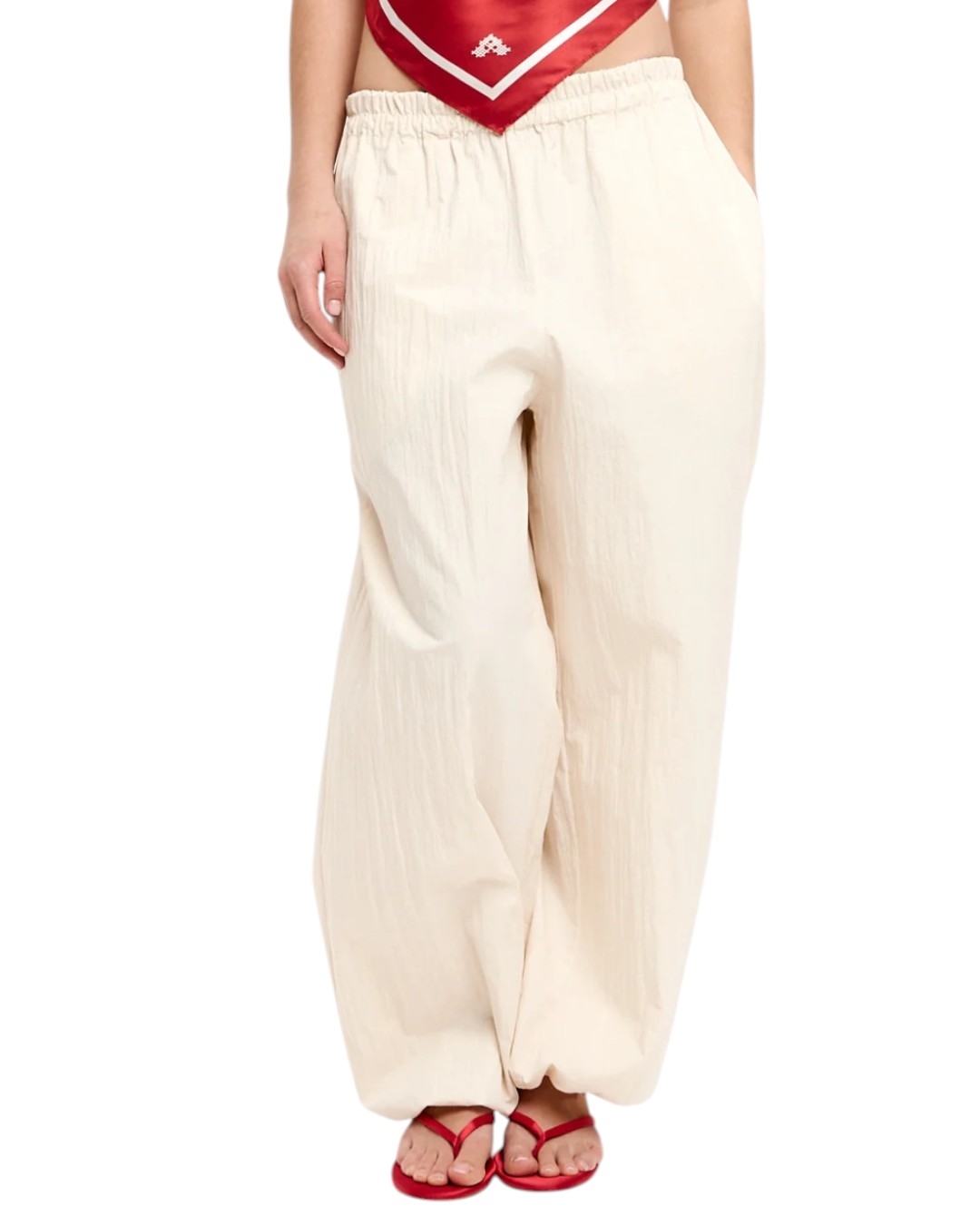 Объемные брюки О-силуэта на кулисе, украшенные авторским 3D принтом, выполнили из 86% хлопка молочного цвета Almond Milk. Модель с двумя карманами по бокам, мягкой резинкой на поясе и по низу. Благодаря натуральному составу, брюки от костюма комфортно носить в помещении и в теплую погоду, создавать разнообразные образы.