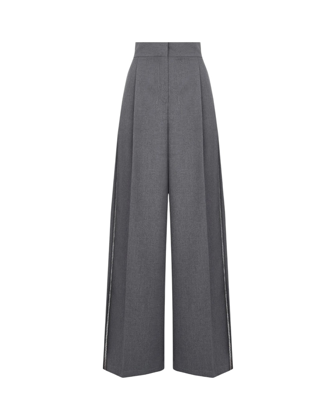 Брюки палаццо на высокой талии изготовлены из комбинации волокон тенселя, района и натуральной шерсти, обеспечивающие превосходную посадку, зрительно удлиняя ноги и дарит приятное ощущение на теле. Передняя часть украшена вертикальными складками-защипами, плавно перетекающими в чётко выраженные стрелки, создающие визуальную иллюзию вытянутых ног и совершенства пропорций фигуры.