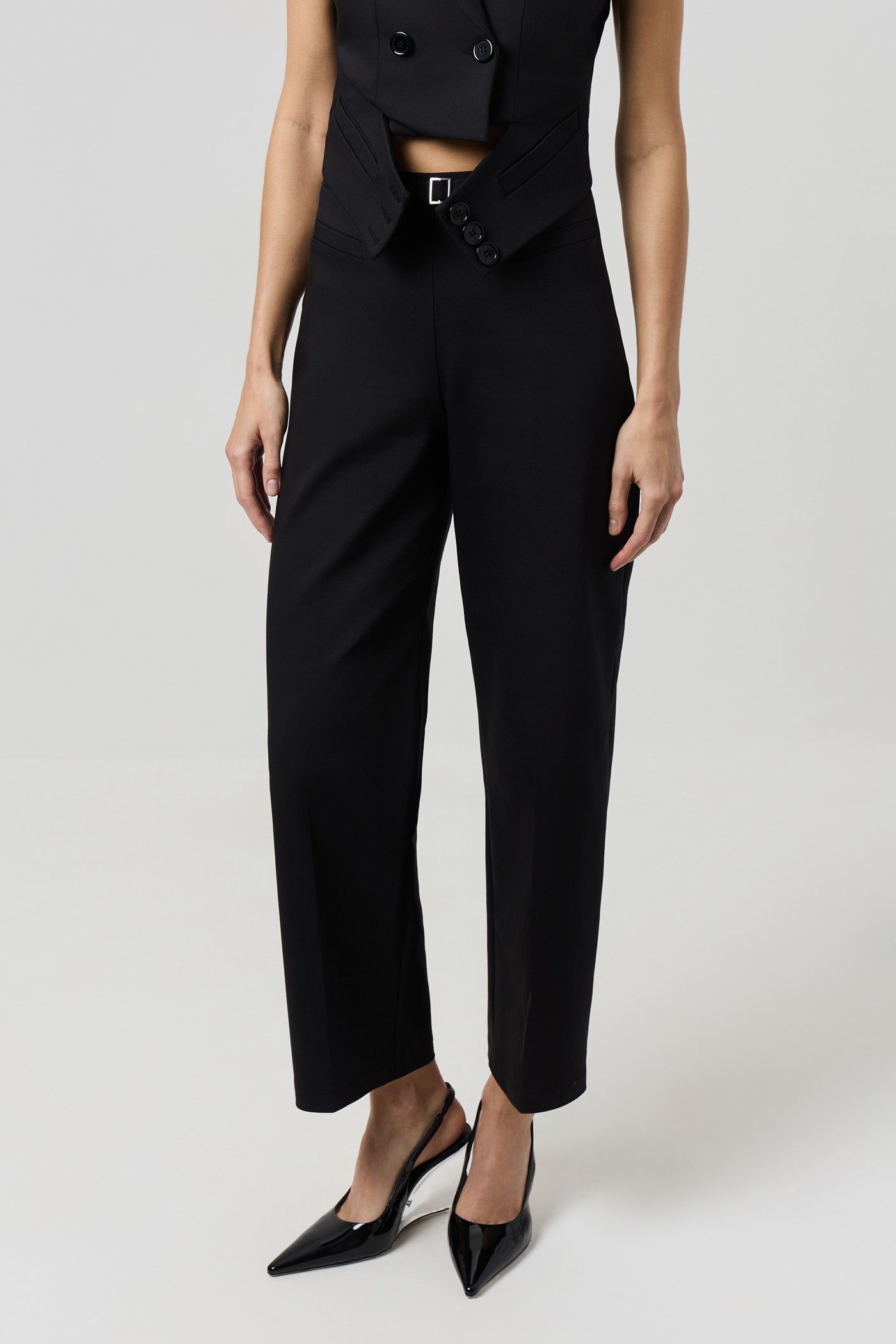 Брюки прямого кроя со стрелками — идеальная классика. Выполнены из смесовой ткани с хлопком, полиэстером и эластаном — материал хорошо сохраняет форму и приятен к телу даже при длительном ношении. Базовая модель с нефункциональными карманами вытягивает силуэт за счёт высокой посадки и хорошо смотрится на всех типах фигуры. Рекомендуем сочетать брюки с жилетом из идентичной ткани или дополнять их пиджаком с блузкой или топом.