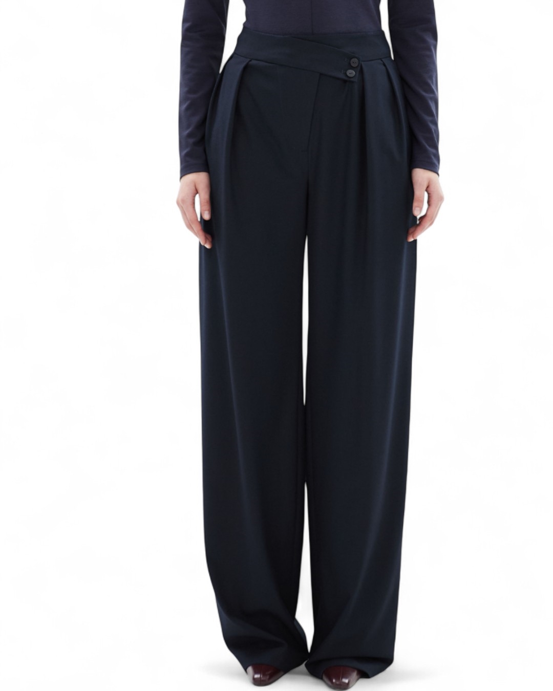 Стильные брюки с акцентом на детали: асимметричный пояс, складки.