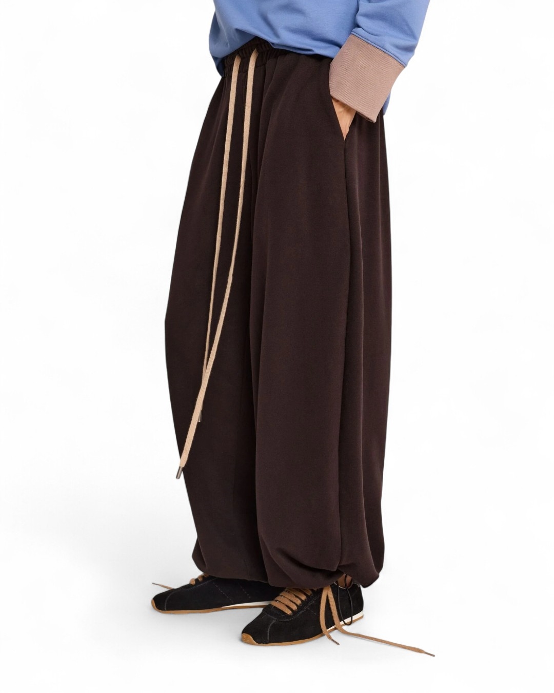 Брюки из мягкого хлопкового трикотажа с поясом-резинкой, длинным шнурком очевидно станут незаменимым элементом твоего гардероба. Длину брюк можно регулировать – для этого низ брючин обработан резинкой со стоппером.