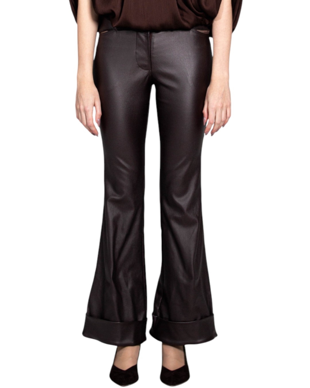 Джинсовые брюки с кожаной фактурой с лёгким клёшем к низу. Удобно сидят, корректирует фигуру. Спереди - застёжка молния.