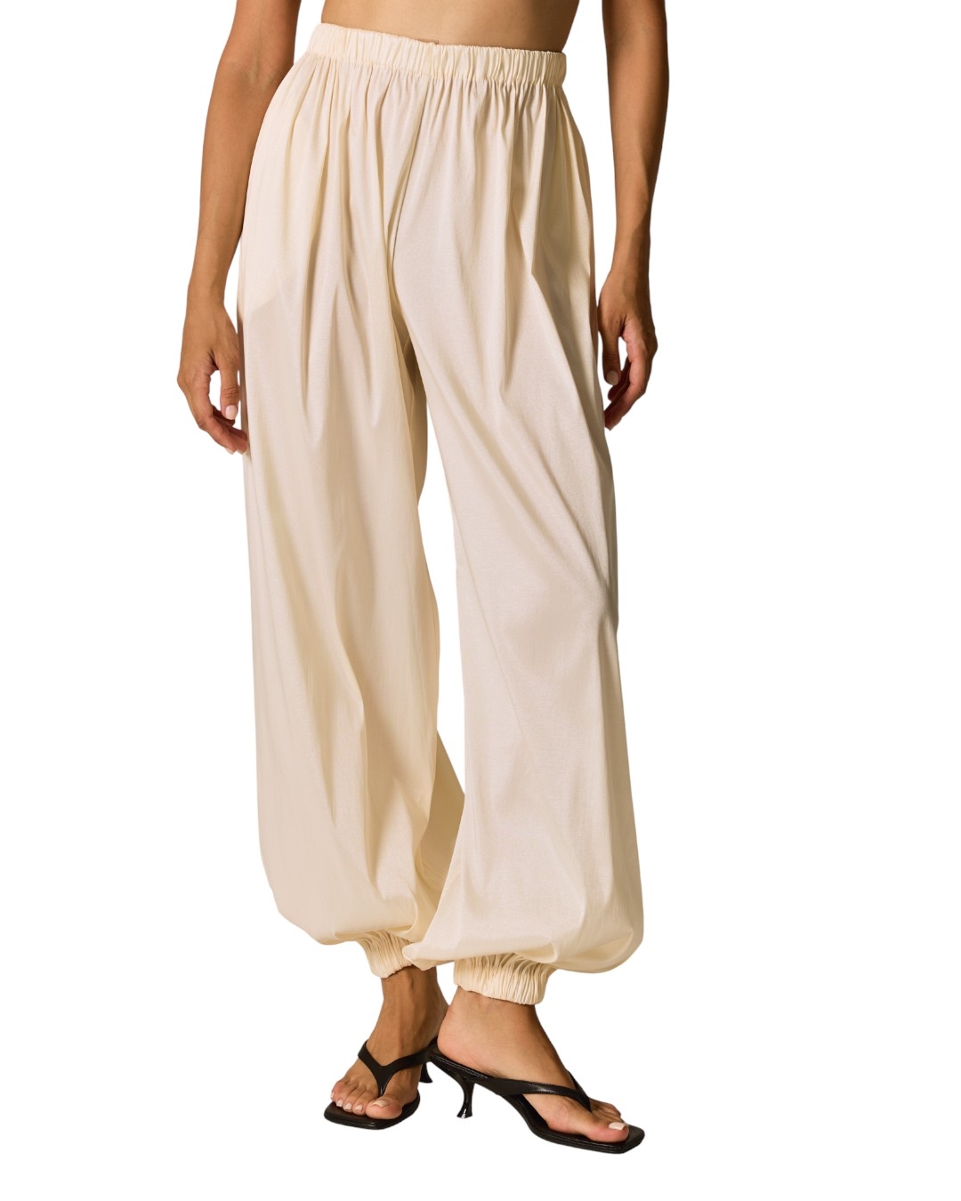 Изготовленные из прочной и приятной на ощупь тафты, эти штаны обеспечивают комфорт в течение всего дня — благодаря эластичной резинке посадка легко регулируется под вашу фигуру. Идеальный выбор для прогулок, путешествий или уютных выходных — они подчеркнут вашу индивидуальность и подарят ощущение легкости и свободы. Легко сочетаем с жакетами и свободными рубашками, или в нашем роскошном стиле носим с бархатными халами или кимоно.
