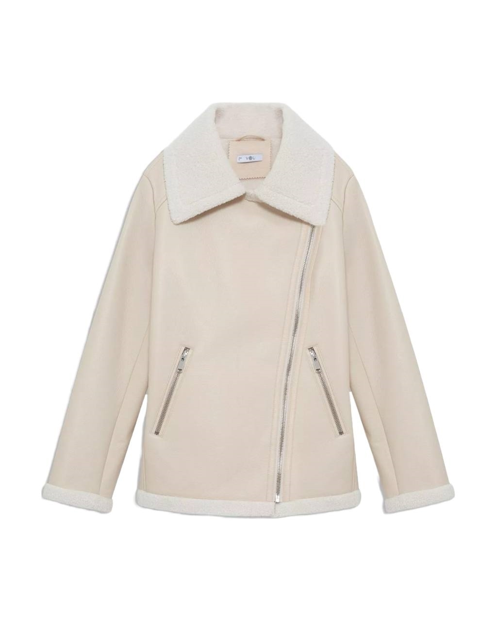 Дублёнка средней длины в нежном кремовом оттенке выполнена из высококачественной экокожи. Модель имеет прямой крой, дополнена широким отложным воротом и манжетами с отворотами, которые отделаны
