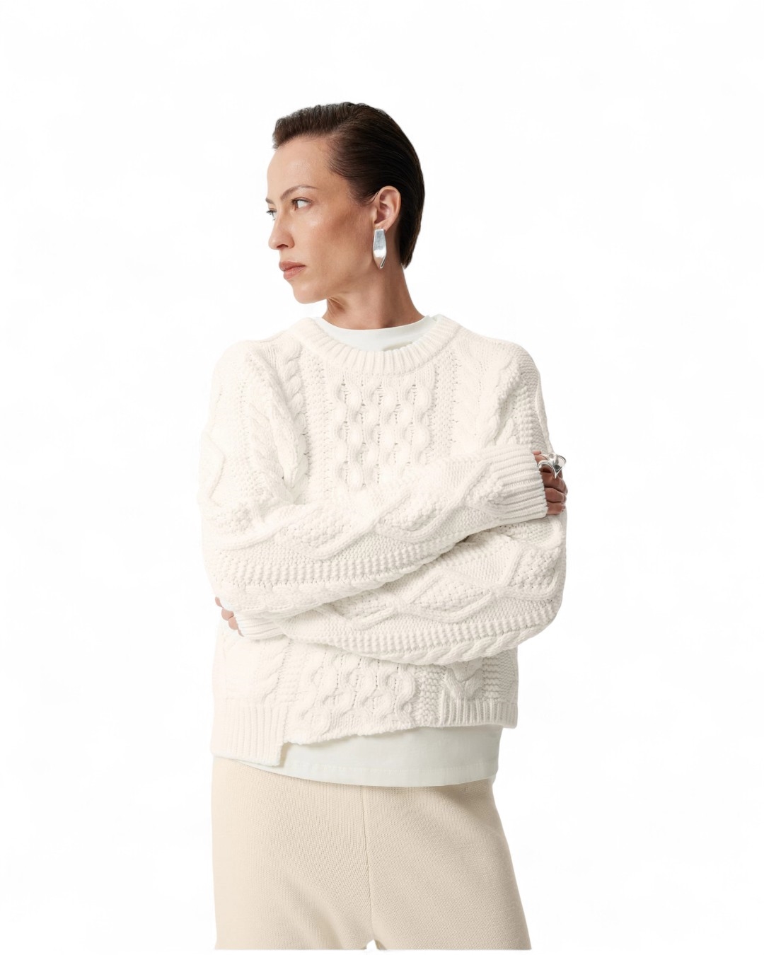 Джемпер с косами — классика зимнего гардероба! Косы и другой вертикальный плетёный рисунок, созданный, словно, вручную, всегда рождают ощущение тепла, покоя, уюта. Укороченный джемпер силуэта умеренный оверсайз выглядит интересно. Он имеет неровную линию низа с разной высотой риба слева и справа. Она придаёт джемперу динамику и наделяет образы с ним чертами модного бунтарского гранжа. Джемпер выполнен из мягкой пряжи с преобладанием хлопка. Она отлично держит форму и очень приятна при тактильном контакте.