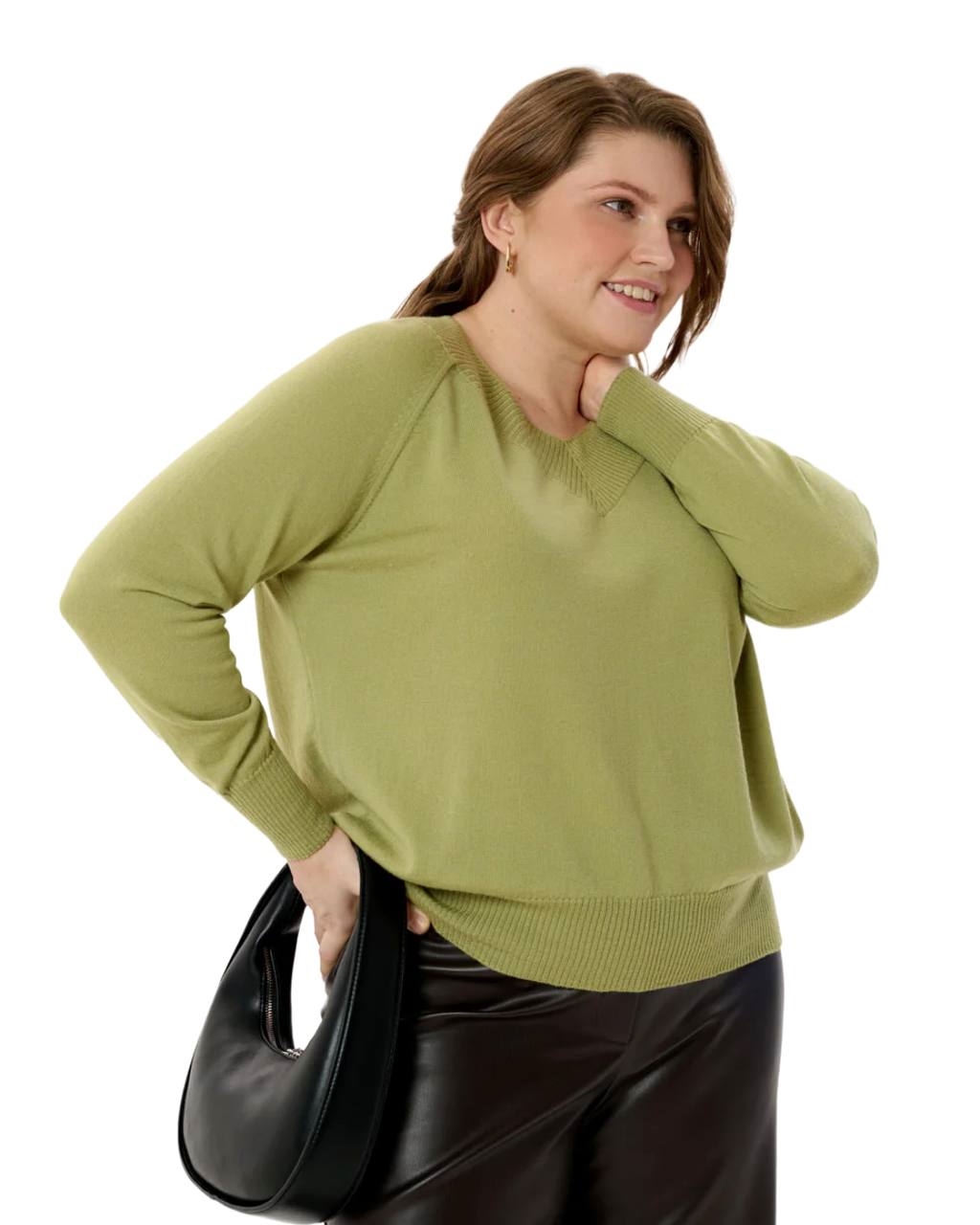 Тонкий, шелковистый, приятный на ощупь джемпер с рукавами реглан. Достаточно свободный, с удобной проймой рукава. Фишкой модели является широкая бейка горловины с фигурными сбавками и без шва спереди. V-вырез не слишком глубокий это оптимально для осенне-зимнего периода. На полочке вывязана вытачка для лучшей посадки на разные типы фигур.