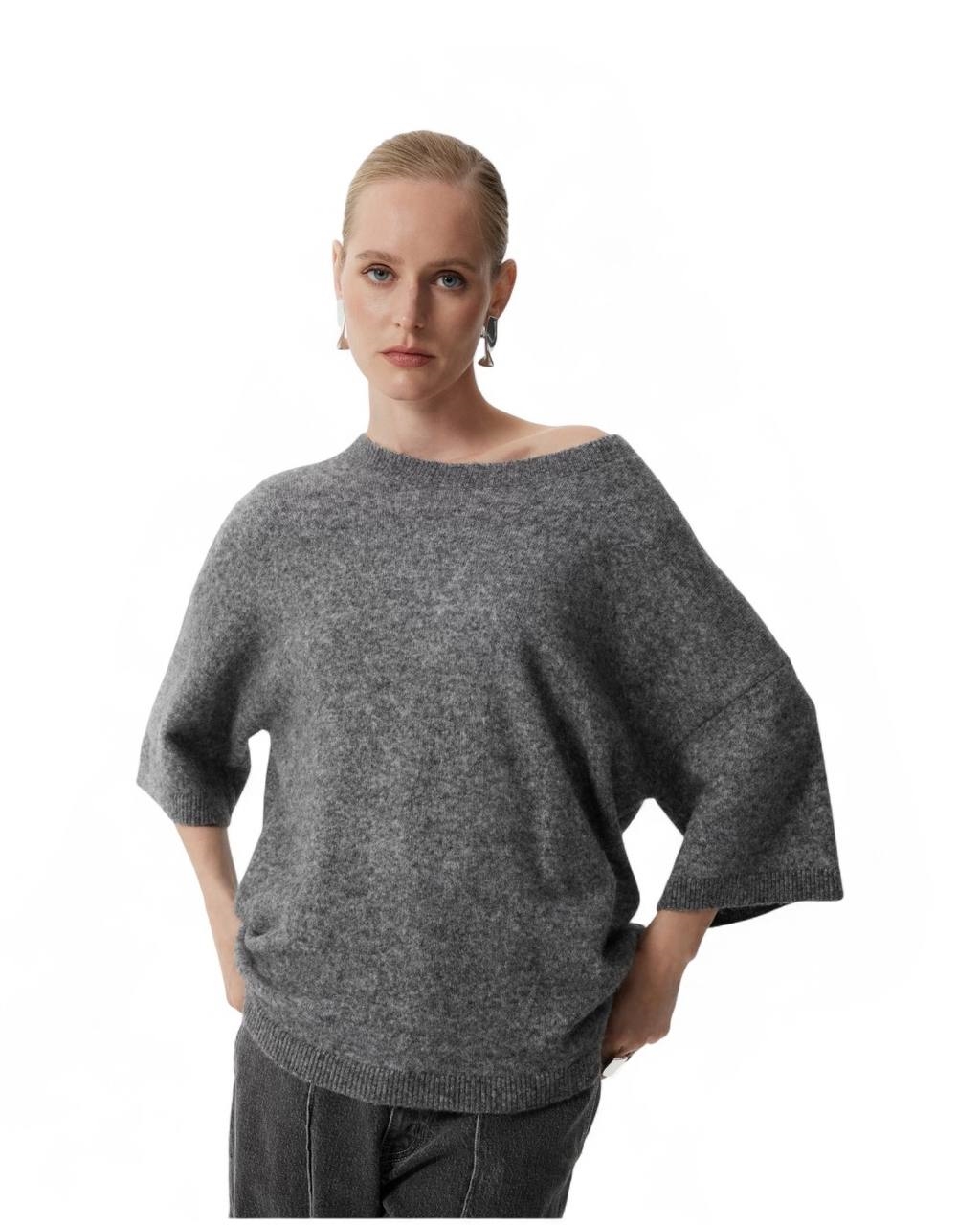 Мода на фактурные вещи по-прежнему актуальна! Серый джемпер силуэта оверсайз с рукавами до локтя, выполненный из многокомпонентной меланжевой пряжи с высоким содержанием шерсти мериноса и шерсти альпаки, — стильная интересная вещь с лёгкой ворсовой поверхностью, очень приятной при тактильном контакте. Спандекс в составе пряжи делает джемпер мягким, пластичным, превосходящим самые высокие ожидания. Этот джемпер исключит раздумья в поиске лучших решений. Он позволит сформировать стильный, лаконичный, интеллигентный комплект за пару минут, красиво сочетаясь и с узкой, и с трапециевидной юбкой, и с элегантными укороченными и зауженными брюками, и с роскошными палаццо, и с джинсами. Как любую минималистичную вещь, джемпер можно дополнить крупными интересными аксессуарами из серебра, натуральной кожи и т.п.