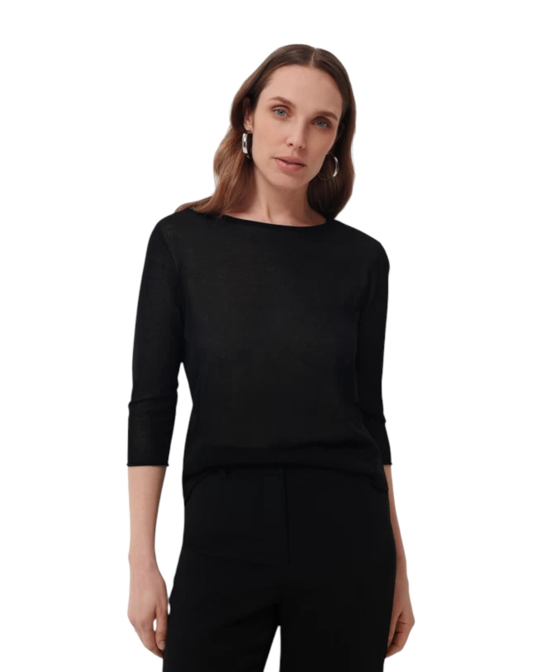 Тонкий, словно паутинка, вязаный джемпер полуприлегающего силуэта с рукавами 3/4 - прекрасный выбор в преддверии жаркого лета! И как самостоятельная вещь, и как составляющая многослойного комплекта с пиджаком, кардиганом, жилетом, джемпер привнесет в образ интересную фактуру, подчеркнув тренд на прозрачные и полупрозрачные ткани, материалы, отделку. Низ рукавов и низ изделия завершены мягким пластичным руликом.