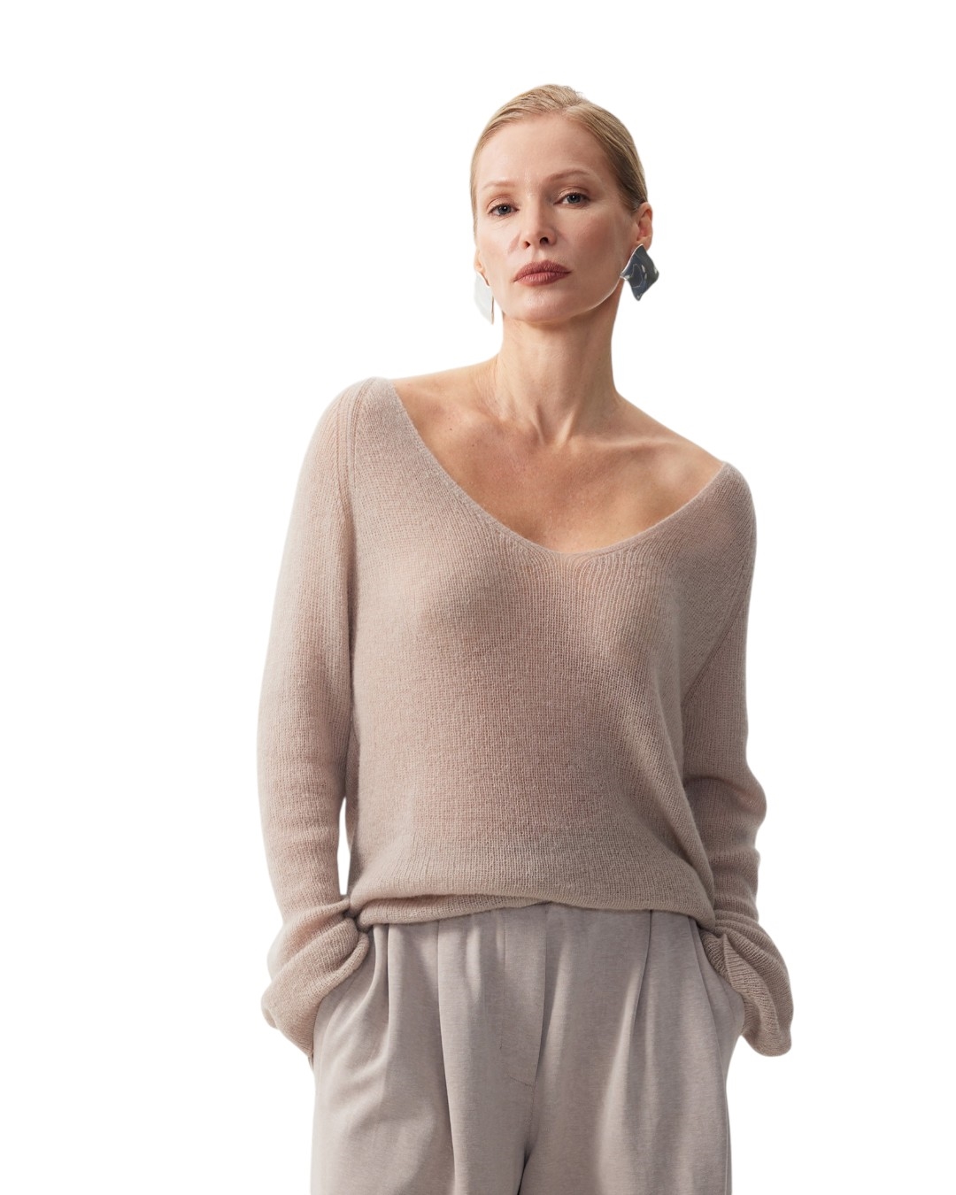Легкий вязаный джемпер с глубокой V-образной горловиной - олицетворение мягкости, уюта, комфорта! Выполненный из тонкой пряжи с высоким содержанием шерсти и мохера посредством разряженного переплетения, джемпер с легкой ворсовой структурой мягко касается кожи, окутывая женщину, словно, нежным воздушным облаком. Джемпер имеет прямую свободную форму с рукавами-реглан, придающими любому образу с ним естественность и непринужденность. Он легок, послушен, пластичен, очень приятен при тактильном контакте. И как единичное изделие, и как часть многослойного комплекта с топом, майкой, блузкой, джемпер станет постоянным спутником женщины и лучшей иллюстрацией выбранных ею модных трендов на экологичные цвета, интересные фактуры, натуральные материалы.