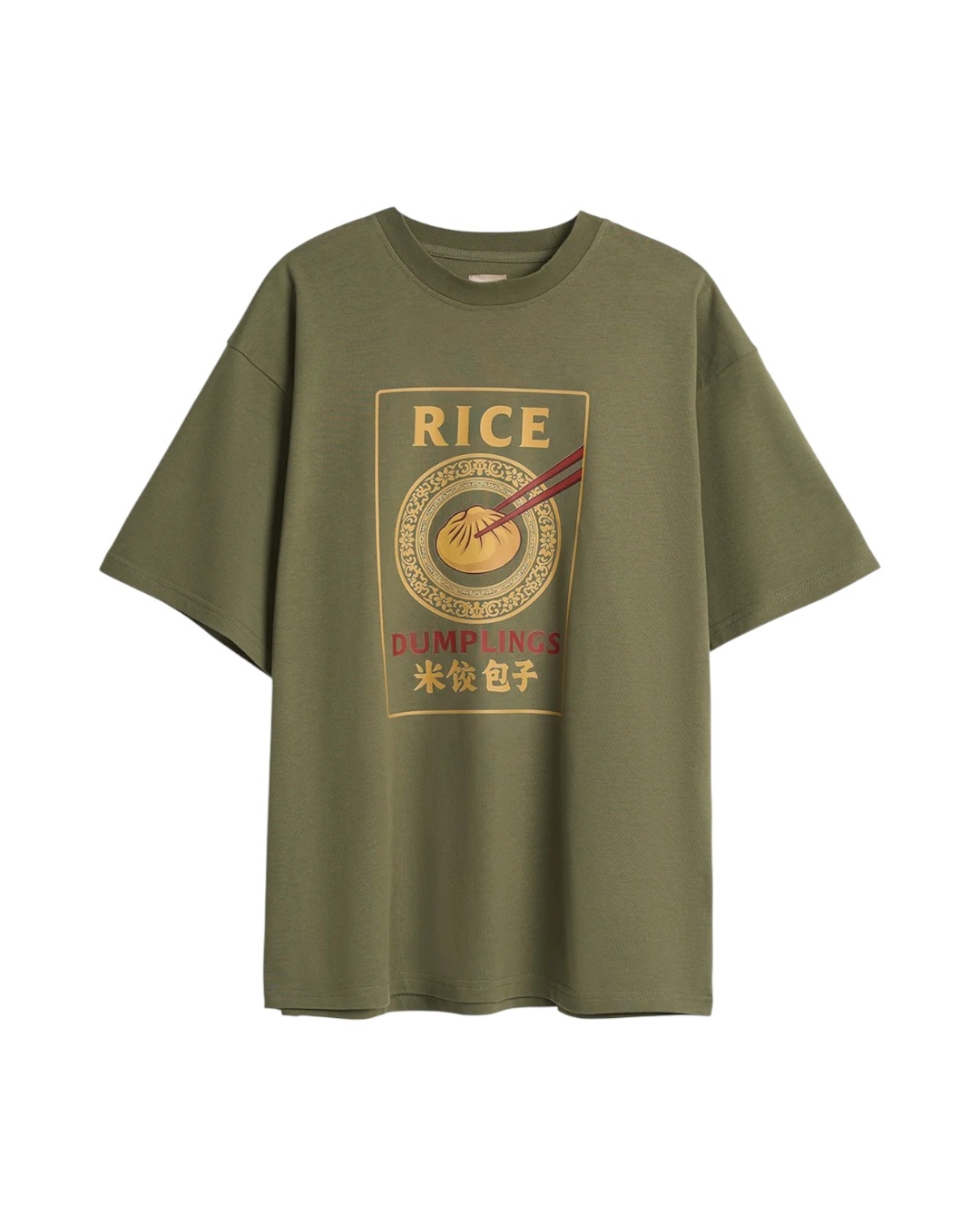 Принт RICE DUMPLINGS — тёплая отсылка к азиатской культуре еды, общения и уюта. Здесь бренд RICE превращает простое блюдо в символ ремесла и традиции. Тонкие золотые орнаменты, глубокий оливково-зелёный фон и акцентные красные иероглифы создают ощущение старинной вывески из шанхайской чайной 50-х. Это не просто еда — это вкус Азии в визуальной форме, часть общего культурного кода бренда RICE, где каждая деталь рассказывает о красоте повседневного, о тепле рук и о жизни, наполненной вкусом и смыслом.