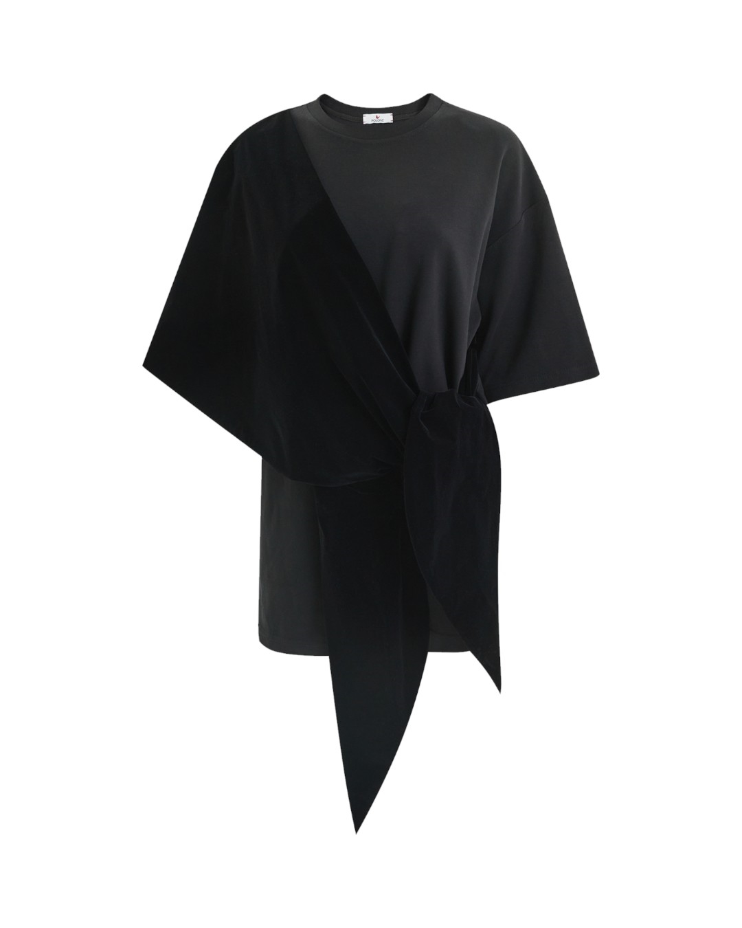 Футболка свободного oversize силуэта из хлопкового трикотажа. Футболка имеет асимметричную драпировку с бархатным напылением в форме платка, завязанного на узел вокруг головы русской боярыни.