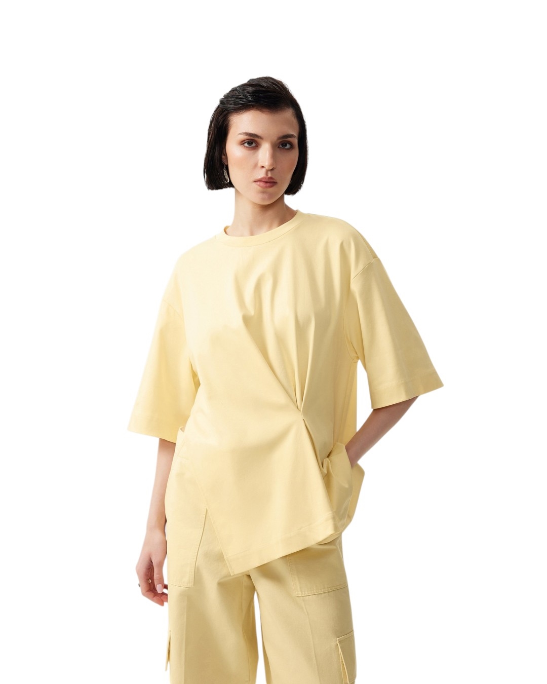 Футболка силуэта оверсайз - стильная лаконичная вещь, способная придать образу женщины остроту современных трендов! Крупный асимметричный защип в области талии формирует легкую вертикальную драпировку, созданную, как будто случайным, непроизвольным образом. Неровная линия низа, как следствие оригинальной деформации передней части, и высокий разрез со смещением поддерживает неформальный непринужденный вайб, делает образ расслабленным и комфортным. Желтый цвет ароматной мимозы со сладковатыми медовыми и цитрусовыми нотками на мягком, шелковистом, приятным к телу интерлоке транслирует солнечное настроение, настраивает на позитив, способствует пробуждению креативных способностей женщины.