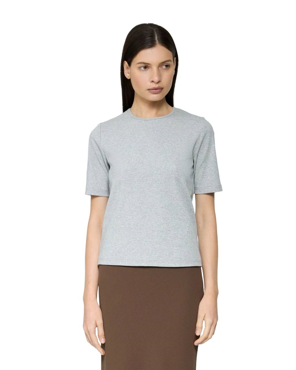 Крой отсылает к облегающим коротким футболкам в стиле 90-ых и нулевых. Позаимствовали у этой эпохи лаконичный крой, округлый вырез горловины и короткие рукава чуть выше локтя –– база на все времена.