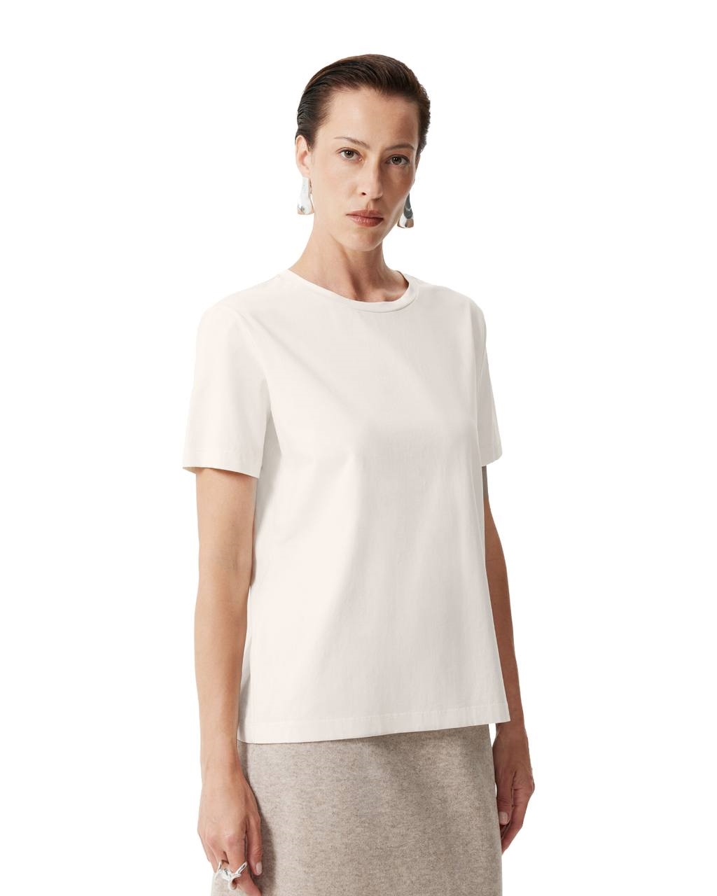 Футболка с коротким рукавом прямой свободной формы — необходимая базовая вещь, основа многослойных комплектов. Прекрасный состав с преобладанием хлопка с эластаном гарантирует мягкость, пластичность, тактильный комфорт. Благородный молочный цвет, освежающий контрастное цветовое сочетание и усиливающий концептуальность монохромного решения, делает футболку универсальной, отвечающей всем требованиям лаконичного, элегантного, умного гардероба.