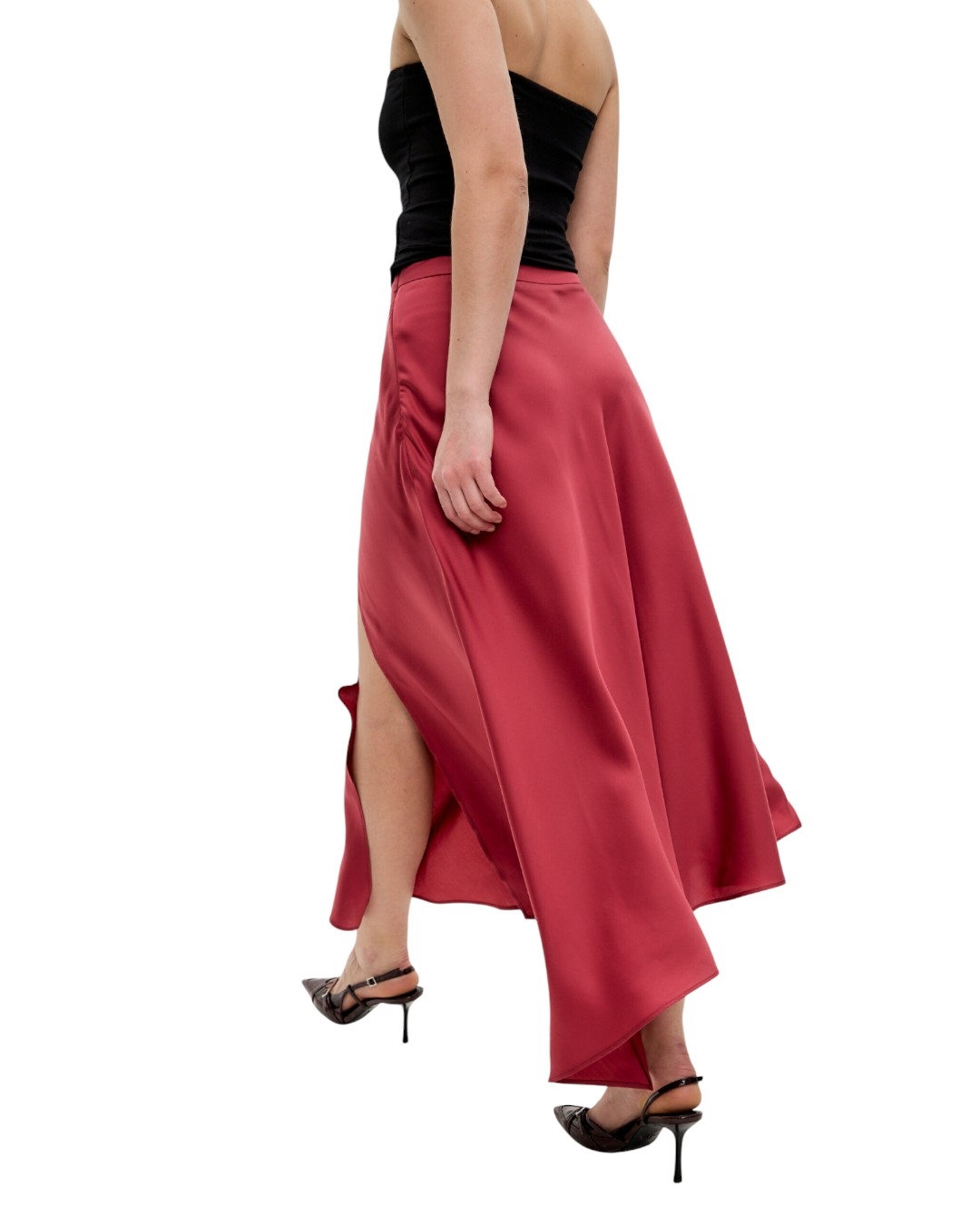 Асимметричная струящаяся юбка из 100% тенселя с акцентным разрезом. Подол юбки создан таким образом, что с разных ракурсов будет казаться, что это разные юбки. Летящая фактура ткани красиво струится при ходьбе, а в сочетании с плотной тканью сюртука FOX или жилета ONE LINE создается сложное сочетание фактур.