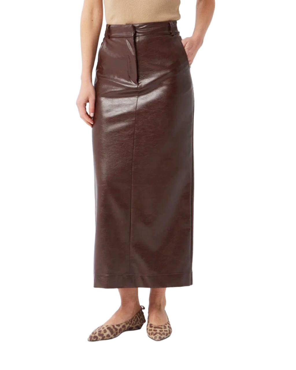 Юбка миди прямого кроя с высокой посадкой и разрезом по центральному шву сзади. Юбка имеет застежку на молнию и крючок, шлевки для ремня, выполнена из экокожи с приятной к телу основой из 100% района.