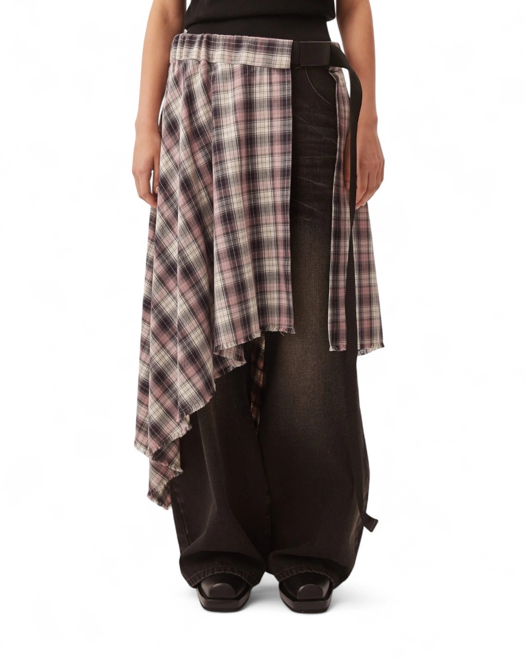 Юбка-саронг без подклада на ремне с застежкой из ткани в клетку. Притачной пояс, низ юбки обработан вручную. Пояс декорирован ремнем из стропы и застежкой для регулировки длины.