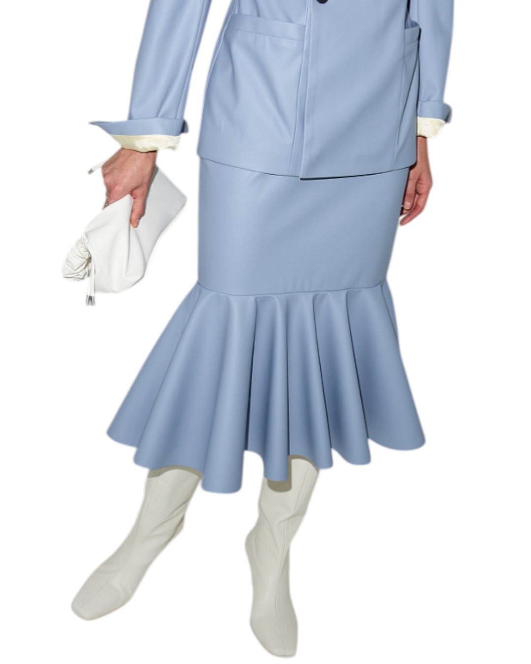 Юбка с воланом из экокожи. Высокая посадка и женственный силуэт «русалку» добавляют изделию выразительности. Длина миди и потайная молния.