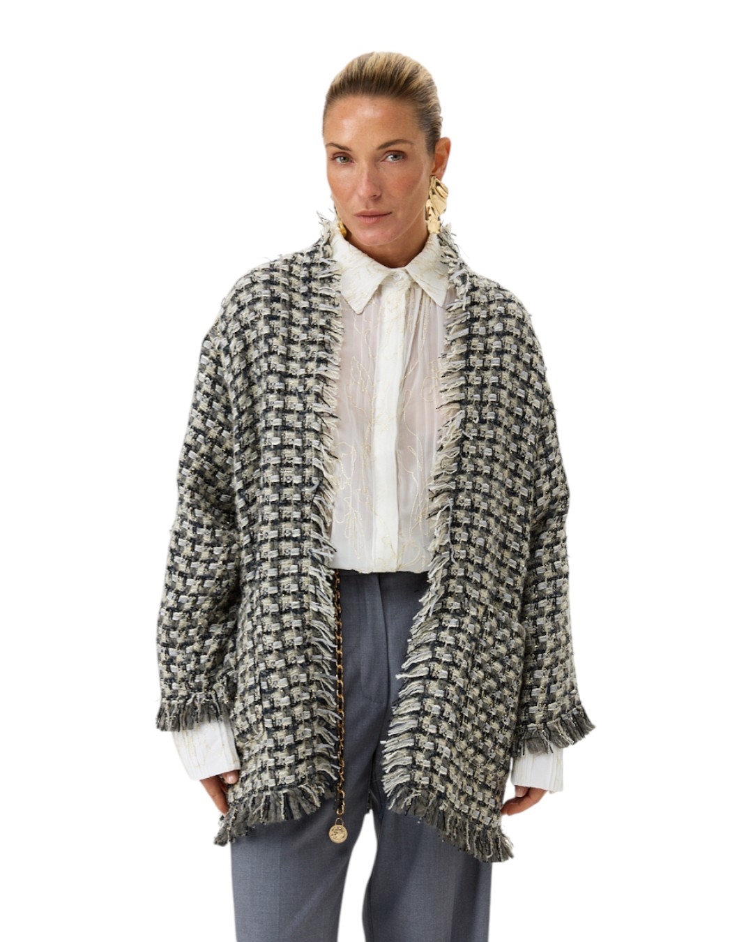 В тренды возвращается женственность, и модели в стиле французской богемы точно не останутся без внимания. Уникальный твидовый кардиган свободного кроя станет основой гардероба, идеально подойдет для расслабленных образов, подарит максимальный комфорт и тепло. Модель дополняет контрастная отделка по краю в виде бахромы.