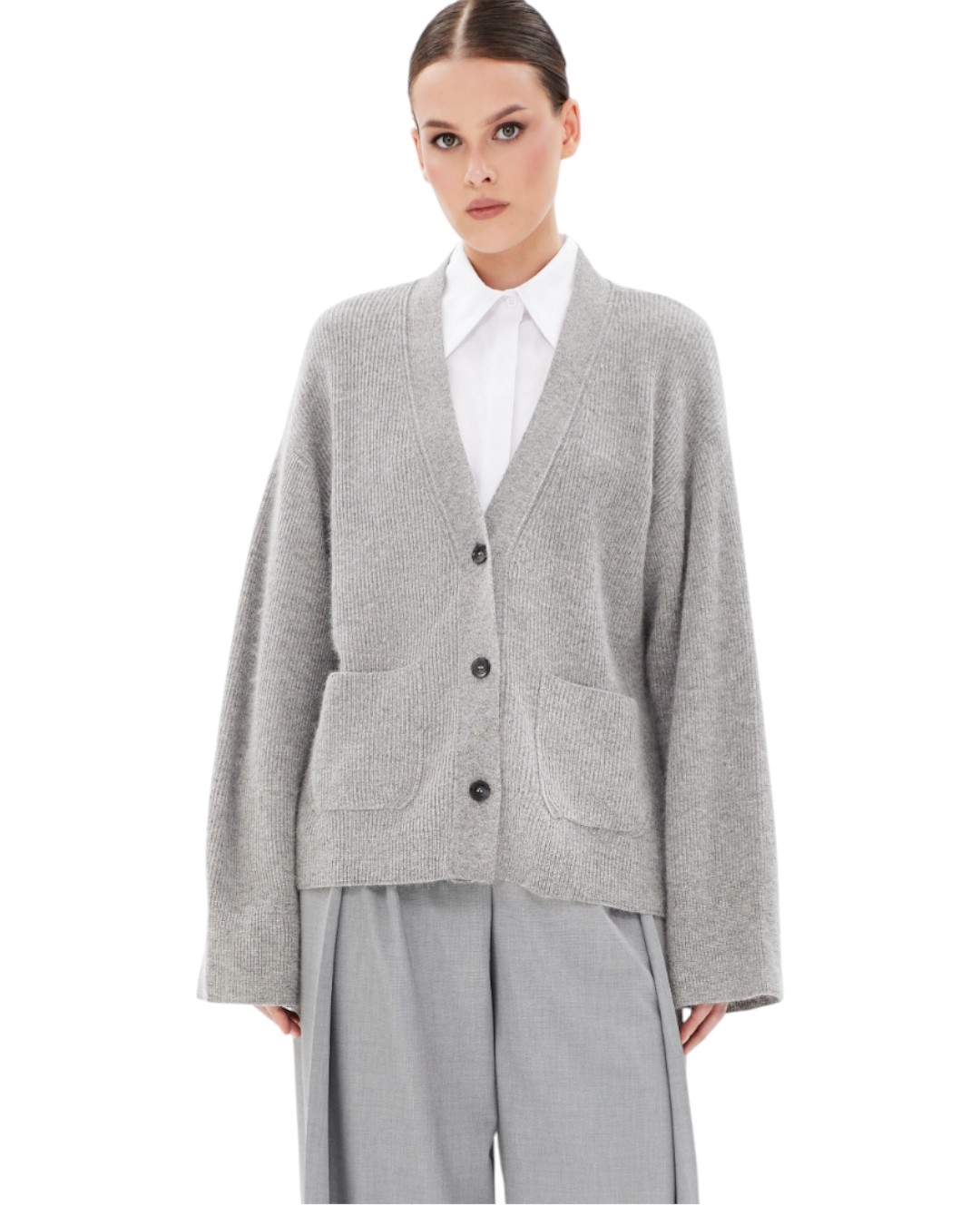 Кардиган вязаный с центральной застежкой на пуговицы. Модель с удлиненным рукавом и накладными карманами.