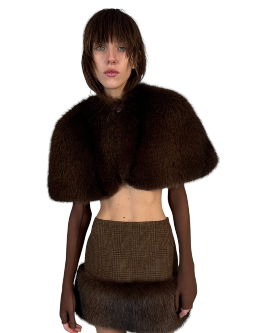 Универсальный укороченный кейп из эко-меха. Застегивается на пуговицу спереди. А-силуэт, плавные линии. Одновременно уютный, экстравагантный и самодостаточный. Можно носить как самостоятельный элемент гардероба, а также как второй слой или как согревающий аксессуар на верхнюю одежду.