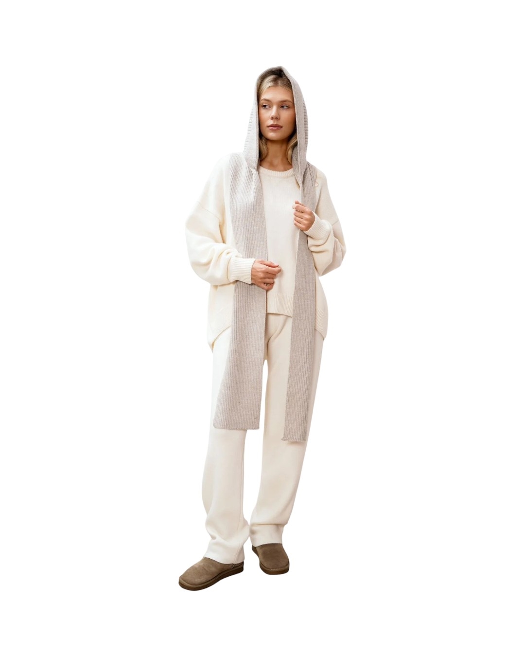 Уютный костюм, состоящий из брюк и джемпера с круглым вырезом в благородном молочном цвете. Модель сделана из шерсти, хорошо сохраняет тепло и приятна в носке. Джемпер и брюки прямого кроя прекрасно подойдут под любой тип фигуры.