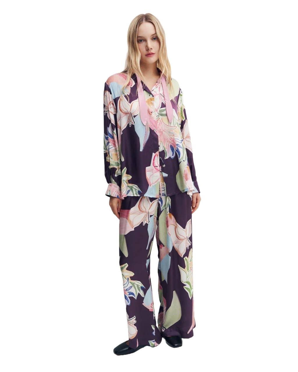 Костюм из летящей блузки с тонкими богемными завязками на воротнике и свободными брюками из шелкохлопка. Воротник можно носить как завязанным, так и оставить летящим для более непринужденного образа. Идеальная ткань для любой погоды не оставит никого равнодушным: комфортная и уютная на ощупь благодаря хлопку в составе, вместе с тем роскошная и шелковистая на вид. Блузка и брюки идеальны как в комплекте, так и по отдельности в сочетании с вещами из вашего гардероба, например джинсами.