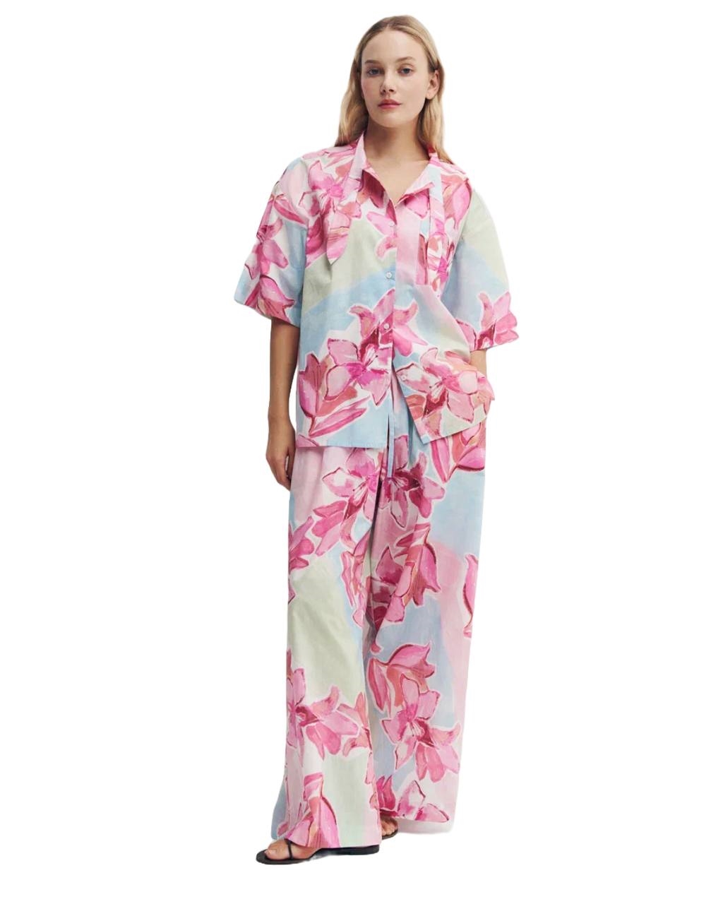 Комплект с брюками с тропическим настроением из самого нежного и мягкого хлопка - батиста в свежем принт с лилиями. Комфортная рубашка свободного кроя, вдохновленная гавайским фасоном, дополнена игривыми ленточками на воротнике, которые можно носить как завязанными, так и оставить разлетаться при движении. Свободные, идеальной посадки и ширины, брюки с карманами можно регулировать по посадке за счет эластичного пояса и ленточек. Блузка и брюки идеальны как в комплекте, так и по отдельности в сочетании с вещами из вашего гардероба. Комплект универсального предназначения.