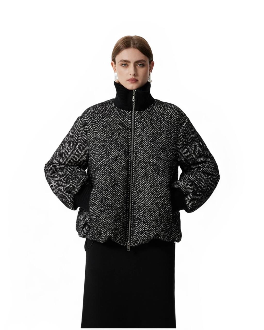 Куртка на синтепоне легкого трапециевидного силуэта со спущенным плечом из мягкого фактурного твида с содержанием натуральной шерсти выглядит интересно, современно, свежо. Крупный рисунок "елочка", вызывающий стойкие ассоциации с благородством, изысканностью, сдержанным стилем с ноткой консерватизма интересно взаимодействует с современной формой изделия, которая может быть как свободной, объемной, с небольшим расклешением по низу, так и превращаться в мягкий О-образный бомбер посредством внутренних утяжек по нижнему краю. Манжеты и высокая стойка, выполненные из черного вязаного риба, мягко прилегают к коже и создают надежное препятствие для холодного воздуха. Куртка застегивается на двухзамковую металлическую молнию с внутренней ветрозащитной планкой. Карманы в швах способствуют комфортной эксплуатации вещи.