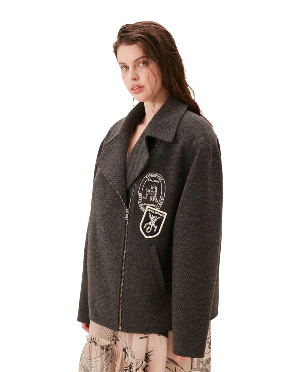 Куртка-косуха свободного силуэта с вышивкой из коллекции WITH LOVE в цвете графит. Модель из пальтовой ткани с прорезными карманами, ассиметричной застежкой-молнией и принтованной фирменной подкладкой.