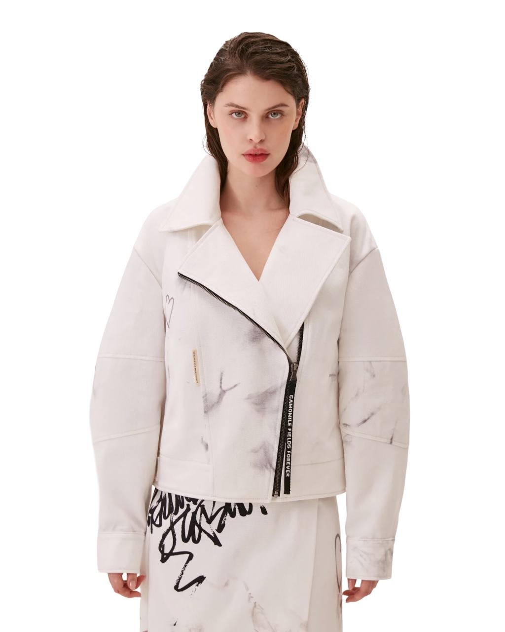 Куртка-косуха свободного силуэта с авторским принтом и нашивками из коллекции WITH LOVE. Модель из джинсовой ткани с прорезными карманами и застежкой-молнией.