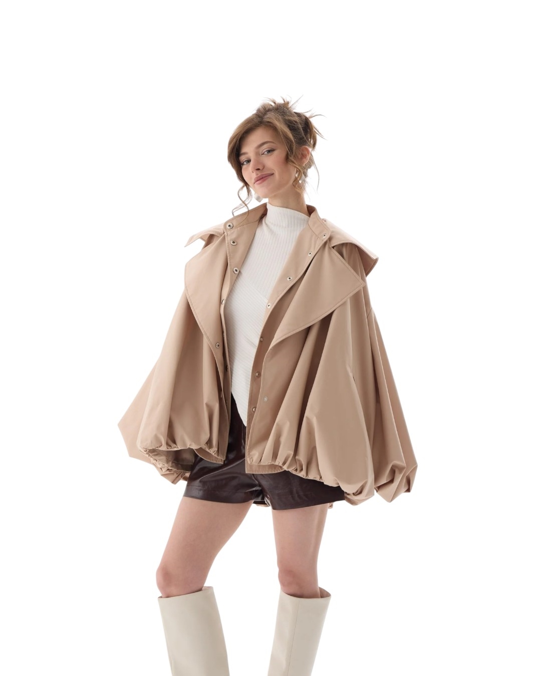 Объемная куртка из водонепроницаемой и не продуваемой плащевки - то, что нужно для осеннего сезона. Благодаря двойному воротнику создается эффект многослойности .