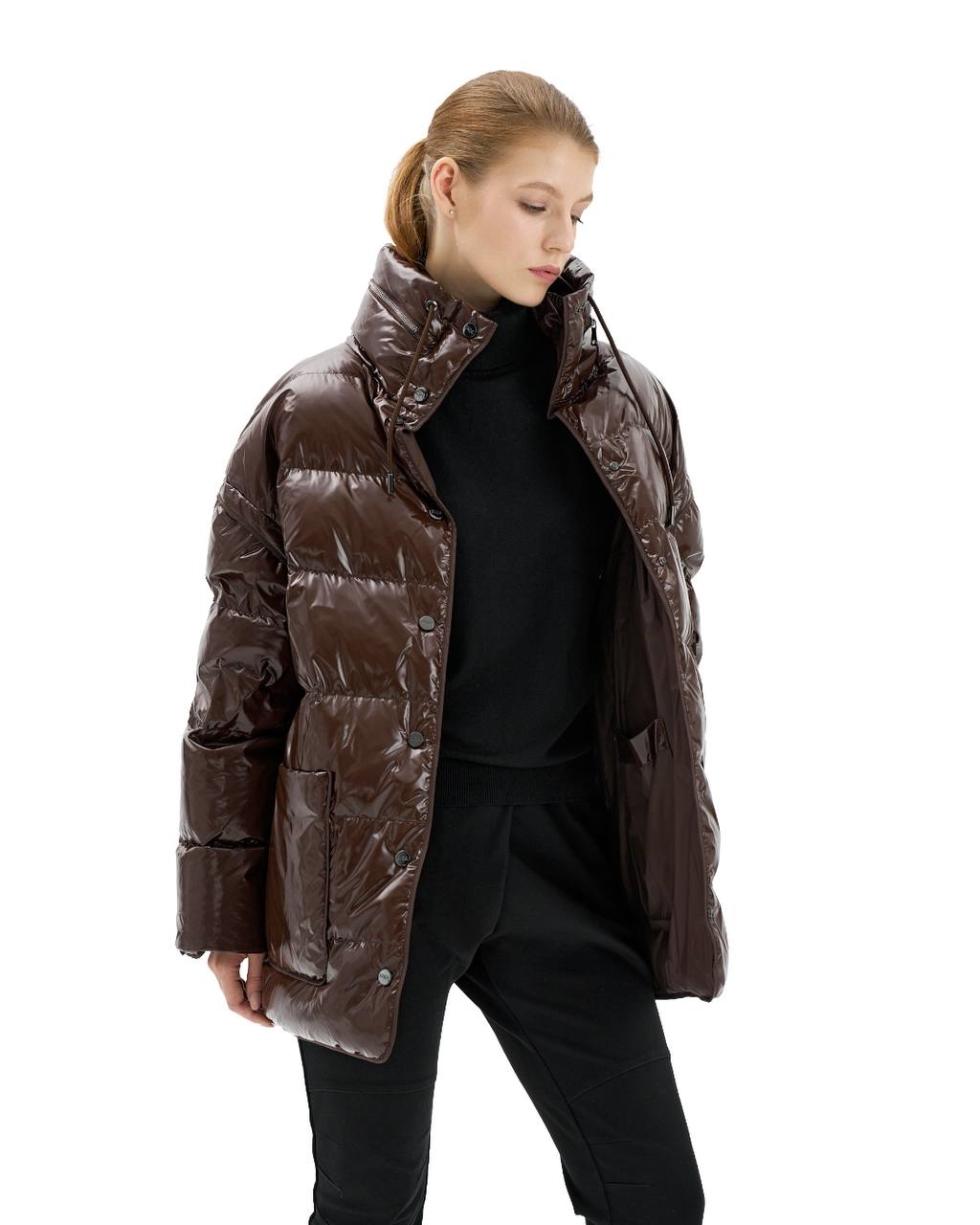 Двусторонняя куртка-пуховик, изготовлена из нейлона с лаковым покрытием на одной из сторон, с водоотталкивающей пропиткой, которое прекрасно подойдет для холодных зимних дней или на холодную осень. Декоративным элементов является стежка со стороны лакового покрытия. В ней вы будете выглядеть стильно и чувствовать себя комфортно, благодаря укороченному фасону и прямому, свободному силуэту до середины бедра. Спущенный рукав, c отделочной планкой в пройме, не увеличивает плечи, придавая силуэту правильную форму. Воротник-стойка, закрывает горло, устраняя необходимость в дополнительном шарфе, в который аккуратно вложен несъёмный капюшон, закрывающийся на молнию и прикрепляющийся кнопками к внутреннему клапану на резинке. Застежка центральная на фирменные кнопки. Спереди находятся накладные карманы, с отделочной бейкой по периметру, которые удобно расположены для хранения мелких предметов.